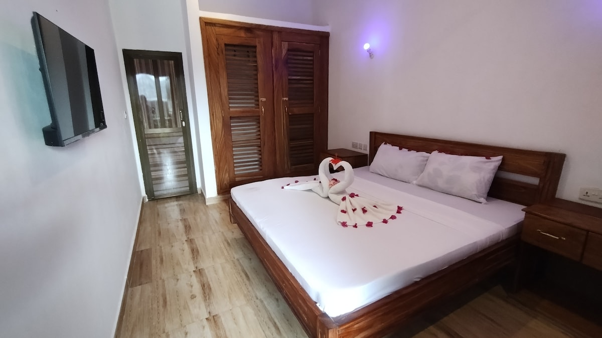 Semi-open room, close to nature, be in touch with your surrounding while sheltered in a king size bed with great view into the palm trees and mikadi trees of the area. Feel the breeze in the night, listen to the night birds and be one with nature. Sleep on your roof top terrace underneath the starlight or just enjoy sunset, we have room service: order a candle light dinner under the moonlight!