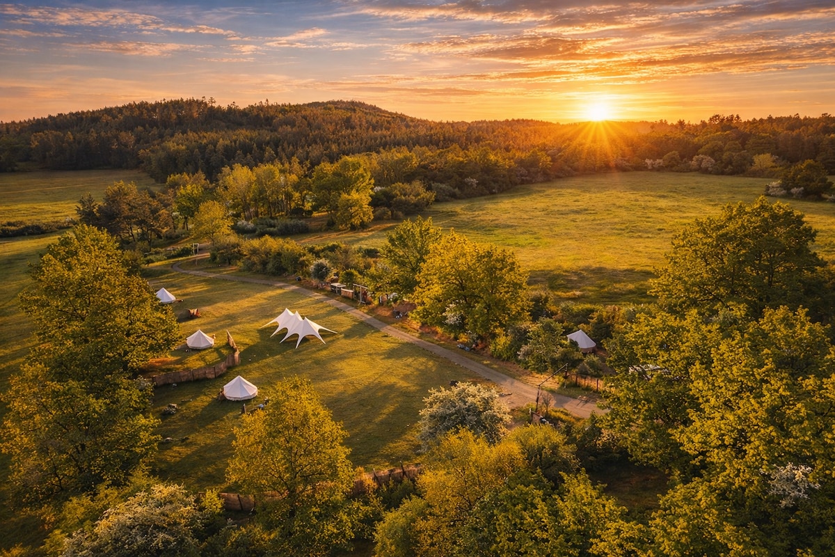 Enjoy perfect peace in a luxury tent in nature with all inclusive. Experience amazing camping in the middle of nature, let your dreams come true under a sky full of stars. A luxury design-furnished cotton tent with all the comfort awaits you. Here you can switch off from the hustle and bustle of the city, read or go pick mushrooms or berries. Tent is only an hour and a half away from Prague. Parking is free directly on the property. FREE PARKING 🅿️ PRIVATE TOILET 🚻