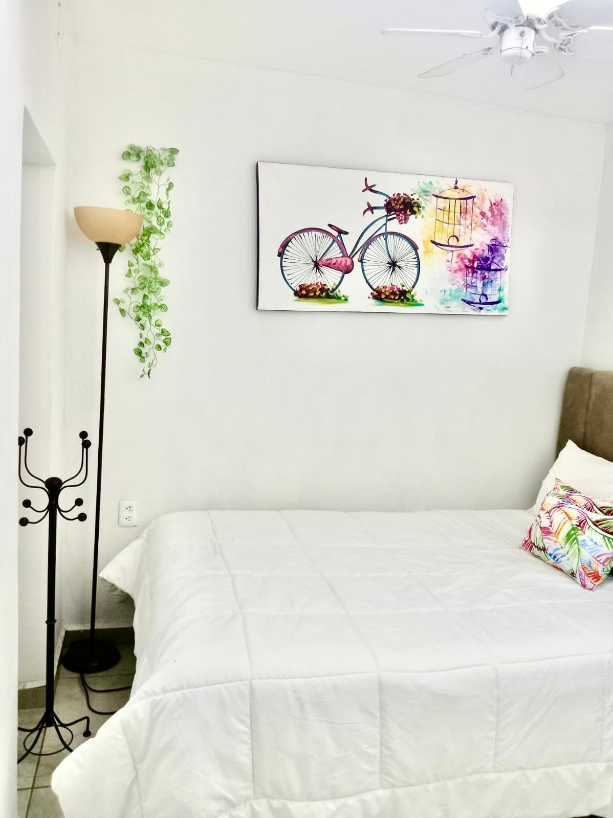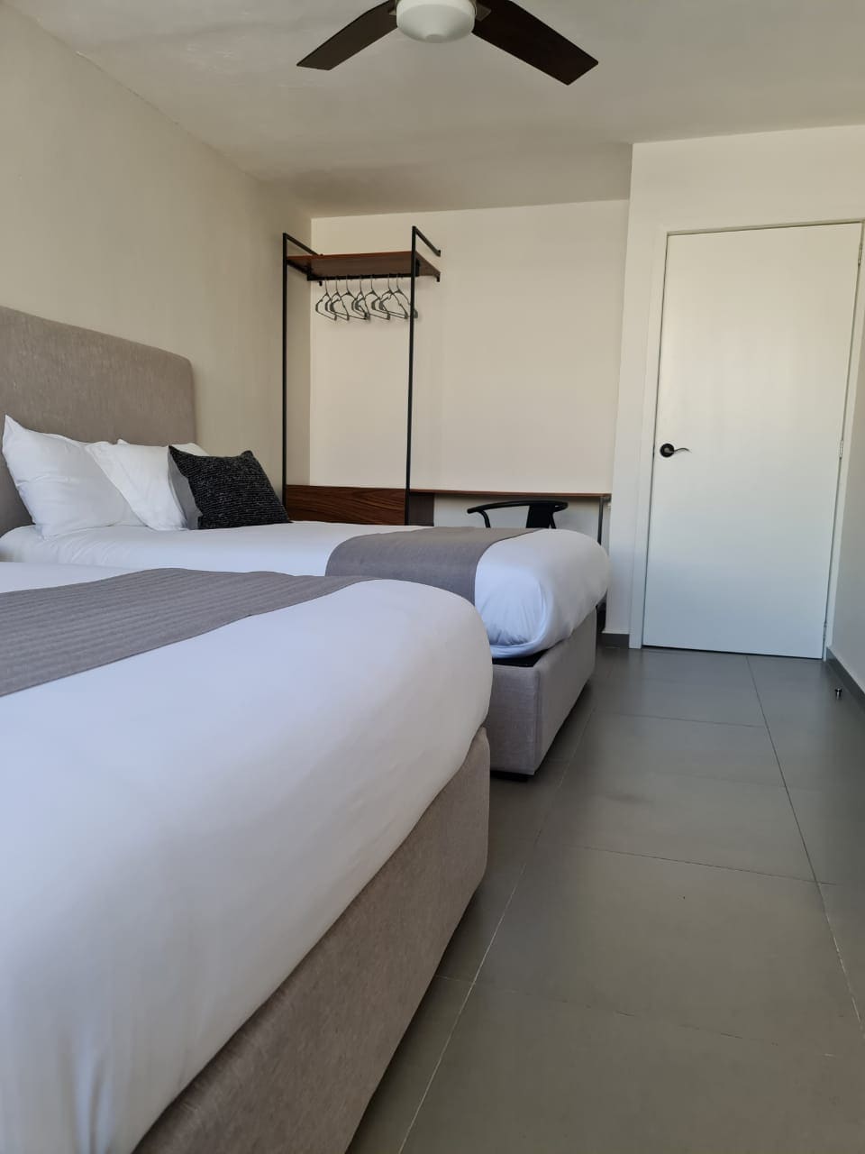 Amplia habitación de una cama queen size con una individual, excelente para descansar y preparar una deliciosa taza de café, cuenta con los utensilios básicos de la cocina, para que puedas preparar tus alimentos, cuenta con dos televisiones ambas con cable e Internet red Wifi de alta velocidad.