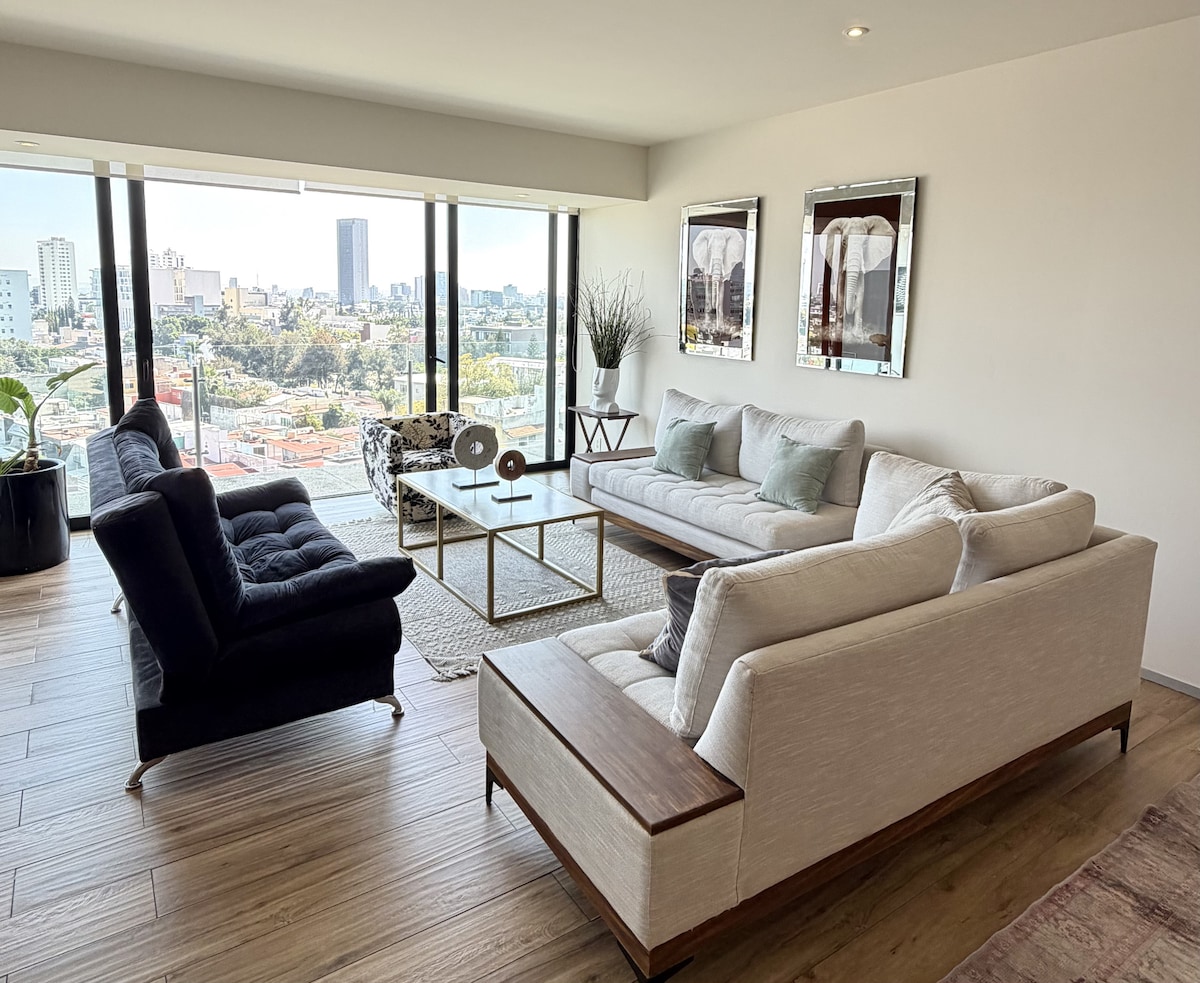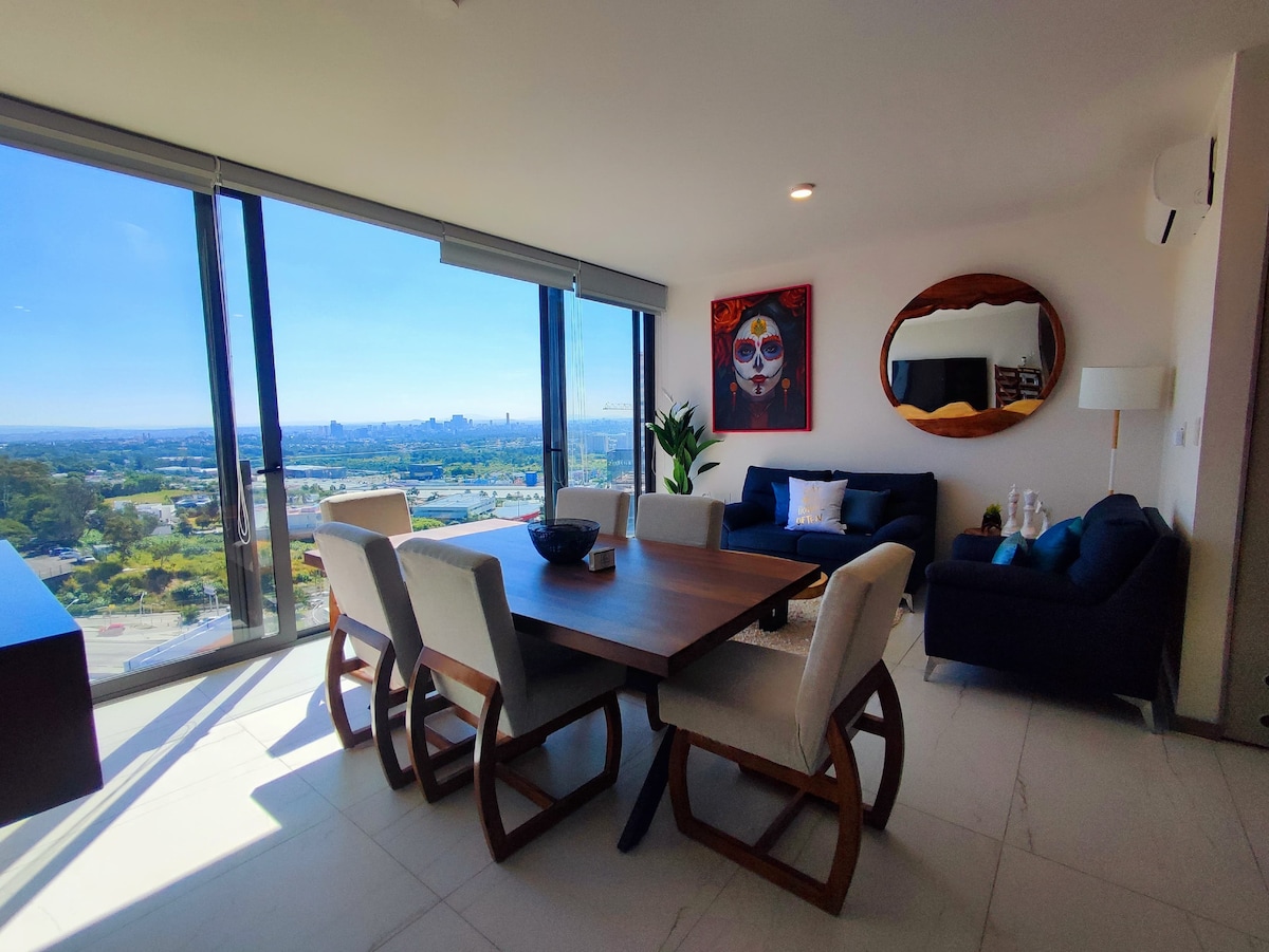 Welcome to your accommodation! The perfect place to enjoy life. The best view of the city of Guadalajara. This place has everything you need for an unforgettable stay. Come and relax in our semi-Olympic pool, work out in our fully equipped gym, or just relax with a glass of wine while enjoying the incredible view from the 16th floor. The space includes: 2 bedrooms 2 full bathrooms Fully equipped kitchen High-speed WiFi Parking included