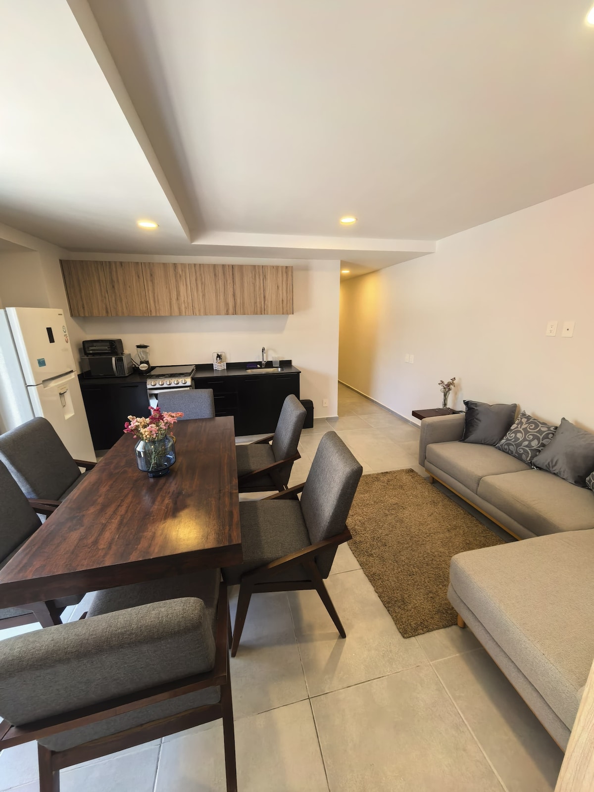 Departamento amueblado, aire acondicionado y calefaccion, rec. principal con walk-in closet y bano completo, la rec. secundaria con dos camas individuales y un escritorio Sala comedor, terraza, smart TV, internet de alta velocidad y cocina completamente equipada. Area de lavado con lavadora y secadora. Puedes disfrutar de una alberca panoramica con hechaderos, gimnasuo sumamente equipado, duchas, bano sauna y vapor. areas sociales y recreativas con mesa de trabajo y cancha de padel.