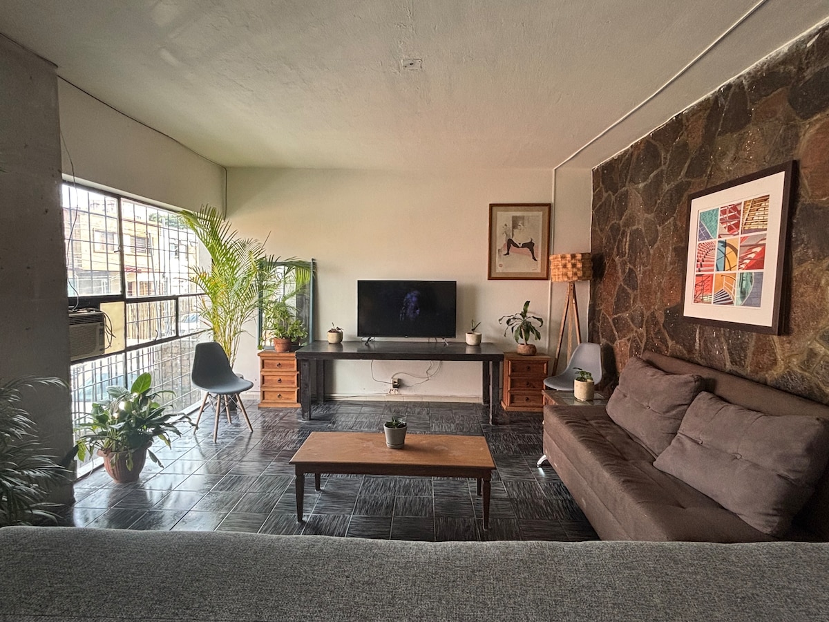 The lifestyle option at Las Sabilas Guesthouse, this light-filled apartment features French doors that open to a neighborhood street, its own kitchen, and abundant space for two or three. Suitable for Netflix and chill, afternoon nap after a swim in the pool, or a spontaneous dinner party with your new Guadalajara friends. We are gay- and lesbian-friendly. We have other rooms at www.airbnb.com/p/lassabilas