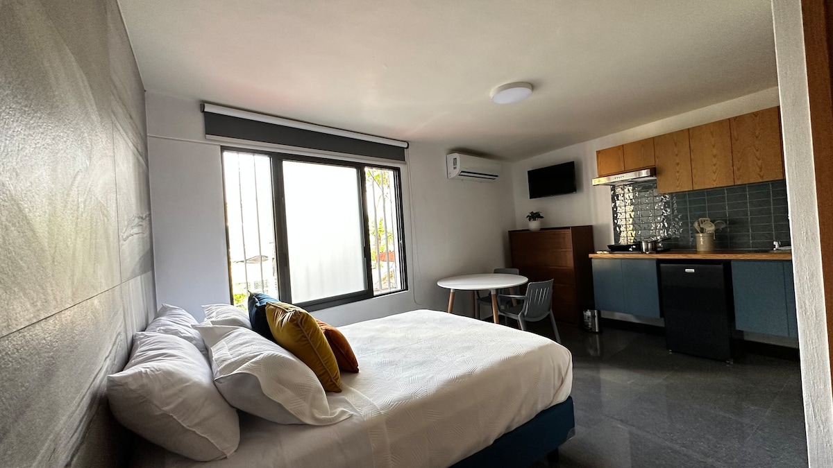 Estudio equipado para una estancia agradable, con 1 cama King Size, cocina, baño privado. Además cuenta con terraza compartida. En Zona residencial tranquila, con excelente ubicación. Cerca de lugares como: Centro Comercial Midtown, Plaza Sao Paulo, Hospital Country 2000, Hospital México Americano, Estación de Tren Ligero Linea 3, Casino, Farmacias, Templos, del Centro Histórico, Bares, y Restaurantes.