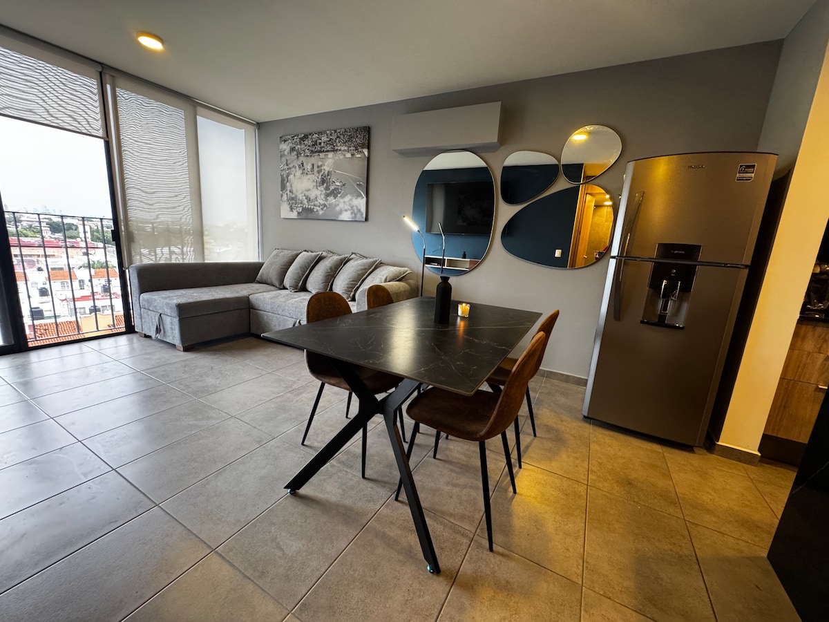 Disfruta de un espacio moderno en el exclusivo condominio Art Park. Con diseño contemporáneo, sala luminosa con vista a la ciudad, comedor elegante y sofá para descansar. Ubicación privilegiada cerca de vialidades, restaurantes y zonas de interés. Ideal para viajes de placer o negocios, este espacio combina arte, diseño y confort para que tu estancia sea inolvidable.