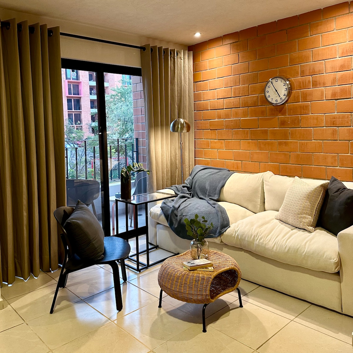 Moderno depto de 50 m² en 5.º piso con vista increíble al bosque. Ideal para descansar o trabajar desde casa. Cuenta con 1 recámara, baño privado, cocina equipada (estufa, microondas, refrigerador), lavadora, secadora y terraza privada. Un espacio tranquilo, funcional y lleno de luz natural para disfrutar la naturaleza con total comodidad.