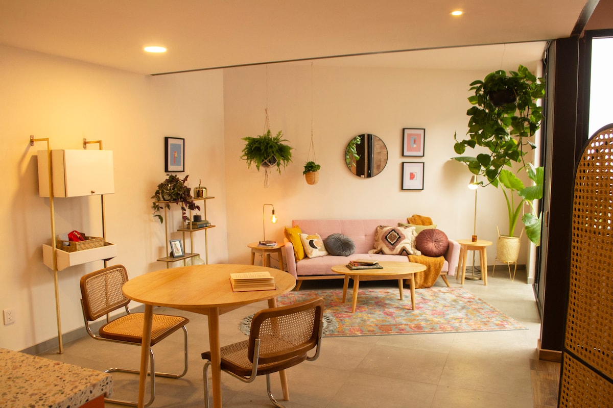 Dale a tus paseos, y a tus días, un punto de partida espectacular, en el que se conjugan diferentes estilos para brindar una experiencia única. Muebles rústicos, llenos de color, le dan vida a este moderno departamento. Su balcón es una joya. El departamento tipo estudio es un espacio abierto donde todas las actividades se intercomunican y sientes mucha amplitud, podrás disfrutar en todo momento del vínculo con la terraza que es a través de un ventanal muy grande que ofrece mucha iluminación al espacio interior y una vista espectacular a la ciudad, se convertirá en tu hogar y nuestro deseo más grande es que lo disfrutes al máximo, te esperamos!! En planta baja existe un Huerto Urbano donde puedes disfrutar de las múltiples variedades de plantas medicinales, comestibles y puedes realizar cosechas orgánicas para tu uso personal y enriquecer tu estancia. Te recomendamos que lo disfrutes ya que es un espacio muy lindo que fue diseñado con mucho cariño, nos encantaría que puedas vivirlo y gozarlo. Te esperamos!!! Para nosotros tu estancia y comodidad es lo más importante y estaremos atentos a cualquier necesidad que tengas para resolverla de inmediato, te esperamos con mucho gusto y disfruta de nuestro departamento que sin duda es tu mejor opción El departamento está ubicado en una zona tranquila, cultural y gastronómica, ideal para experimentar Guadalajara. Está a tres cuadras del Mercado Juárez o el Mercado México, y a 20 minutos caminando del centro histórico. Te recomendamos que puedas moverte y conocer la ciudad caminando, el departamento está perfectamente ubicado para experimentar Guadalajara, muy cerca del centro histórico, el paseo Chapultepec, en una zona tranquila, cultural y gastronómica. Muchos de los atractivos de nuestra hermosa ciudad podrás disfrutarlos sin necesitar gastar tu dinero con algún medio de transporte. La sensación de habitar el departamento es muy grata y acogedora cuando abres los ventanales y el espacio es uno solo integrado con la terraza lo disfrutarás mucho. Por la noche desde la terraza se observa a lo lejos el despegue de los aviones y es un espectáculo que lo puedes gozar. En la calle de libertad o en los alrededores del mercado Juarez (que de la terraza y volteando a la izquierda lo verás a 2 cuadras), podrás gozar de deliciosos desayunos en múltiples cafeterías, la gran mayoría tienen Terrazas con árboles y plantas, experimentaras momentos muy agradables y tranquilos.
