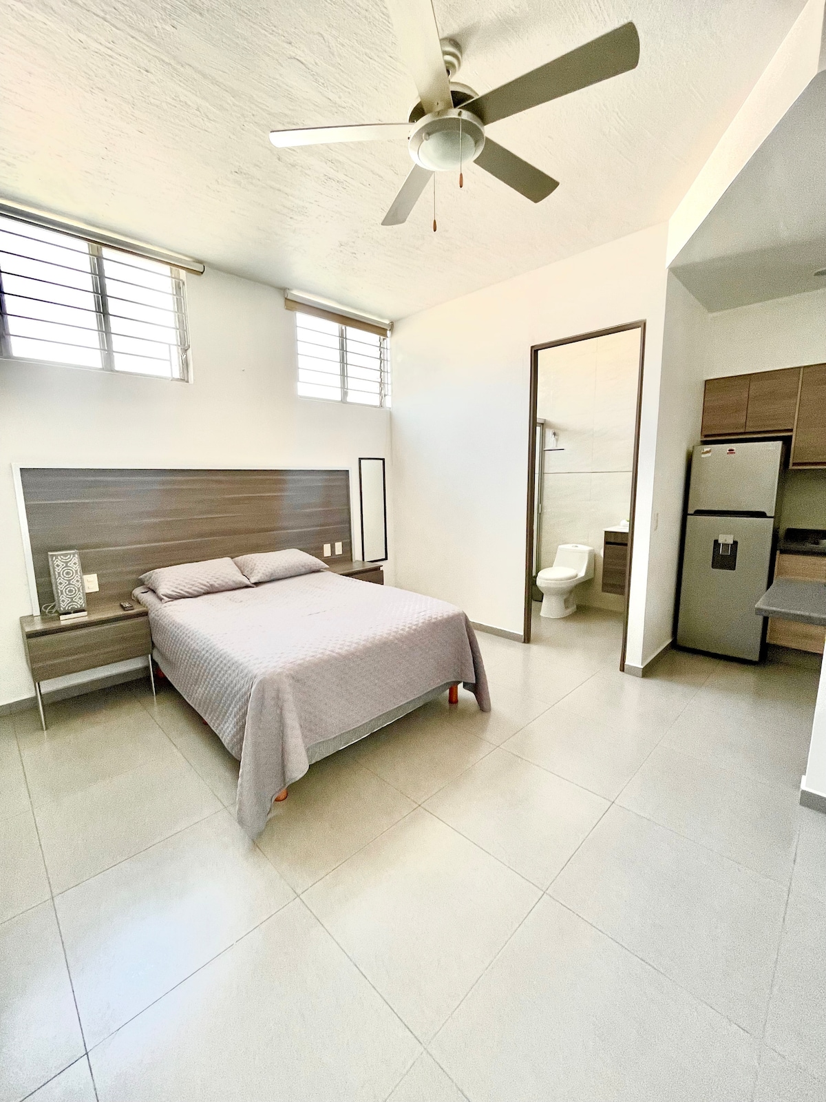 Es un lugar nuevo, estrénelo, muy bien ubicado queda, a tres cuadras del nuevo consulado americano, Y enfrente del hospital Ángeles del Carmen, a una cuadra de plaza México, Zona Minerva, esta en fraccionamiento monraz, zona segura, con muchos buenos restaurantes cercanos, y centros comerciales, contamos con dos hermosos parques a una cuadra. Es una recámara amplia, cuenta con baño completo y cocineta privada.