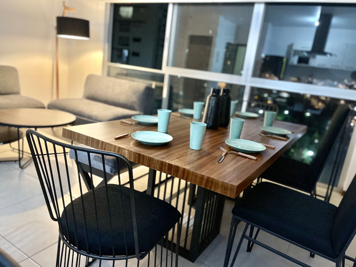 Beautiful modern apartment, fully equipped, perfect for short or extended stays with family or business trips. Fully equipped kitchen, 3 rooms with A/C for heating and cooling, 2 full bathrooms, and 1 guest bathroom, TV room with A/C, dining room, and terrace with incredible views of the city. We offer a pool, elevator access to the entire building, and 24/7 security. Underground covered parking for two cars. Located in the Minerva Zone.