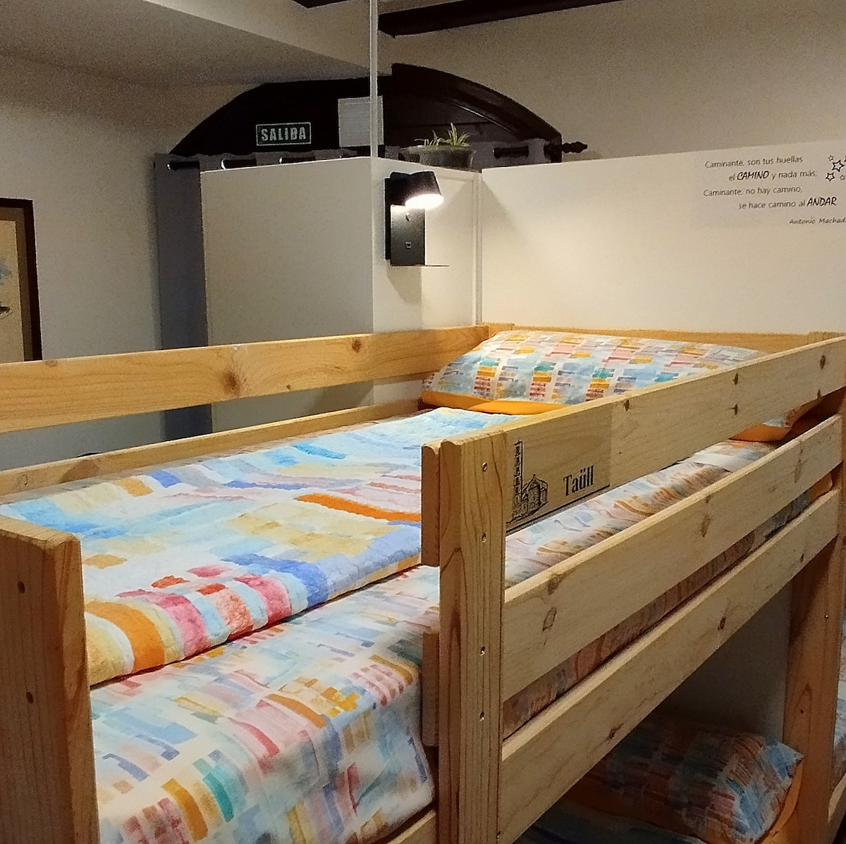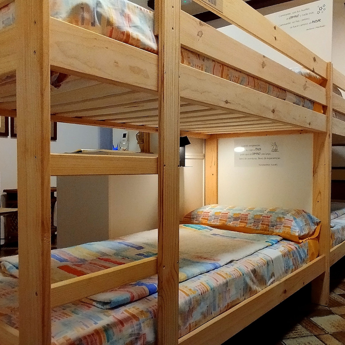 Cama baja en litera doble en habitación compartida de 8 camas. Somos en esencia un lugar de acogida de personas Peregrinas, pero recibimos también a todas las personas que valoran una ubicación más acogedora y menos masificada. Ofrecemos una alternativa de alojamiento en clara distinción con otros de más convencionales e impersonales: atención personalizada, en pequeños grupos, en contacto con la naturaleza, siendo consecuentes con los valores naturales, culturales, comunitarios y sociales.