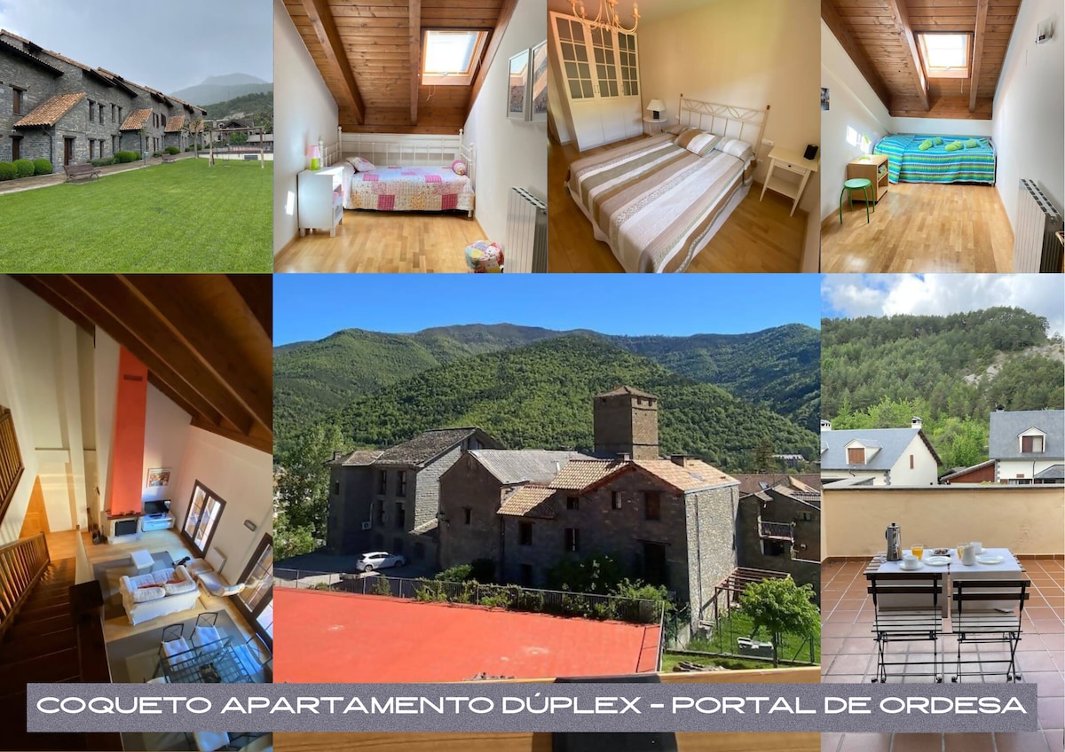 Dúplex en Urbanización ENTREPINOS Planta baja dispone de un aseo, salón con sofá-cama doble de 140, Tv led de 43" y cocina independiente completa con menaje. Planta superior 1 dormitorio cama de 150, 2º dormitorio con dos camas de 90 y baño grande con bañera. Terraza-jardín privado de 45m con magnificas vistas despejadas a Collarada Sabanas y toallas no incluidas Leer normas de la casa