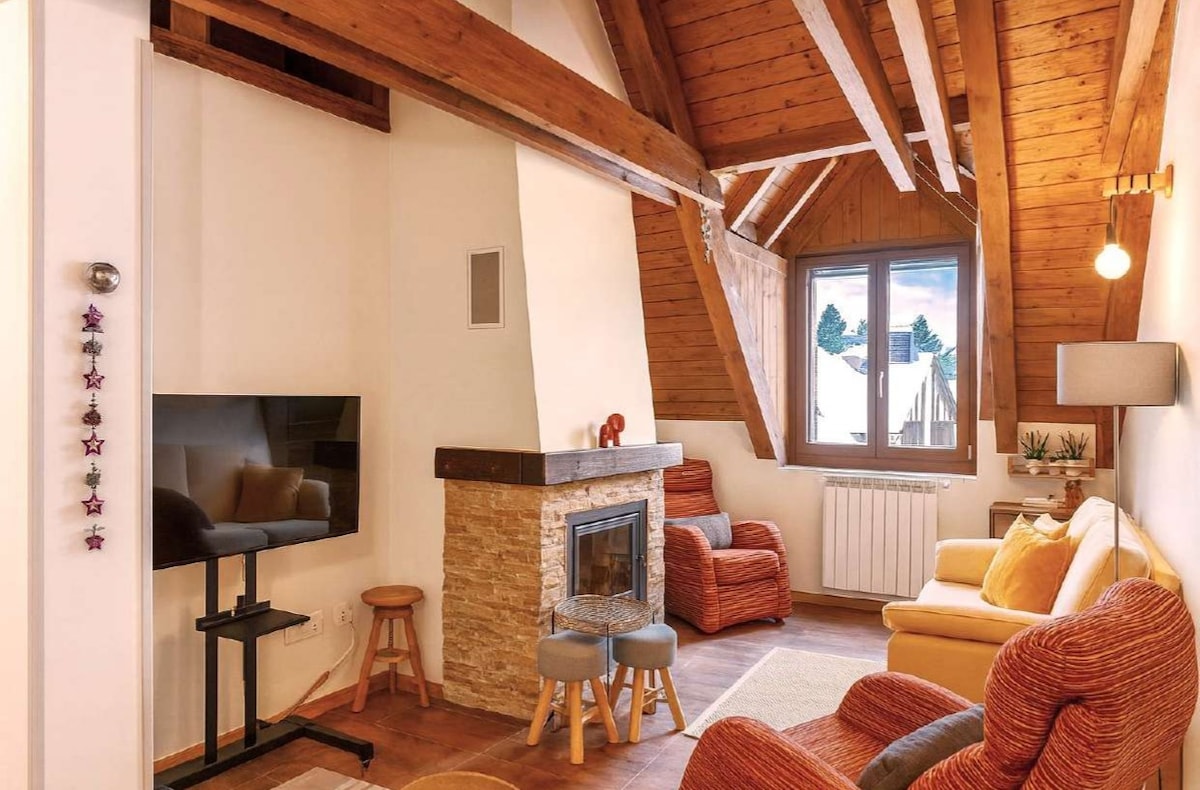 Ground-floor cozy apartment in Villanúa 🏔️ with a spacious garden-like terrace, perfect for sunny breakfasts or starlit dinners. Ideal for couples or families who love skiing ⛷️, hiking 🥾, and nature 🌲. Wi-Fi, Smart TV, full kitchen, air conditioning, and heating. Pets welcome. Easy parking at the door and just a few steps to access. Enjoy a charming retreat in the heart of the Spanish Pyrenees.