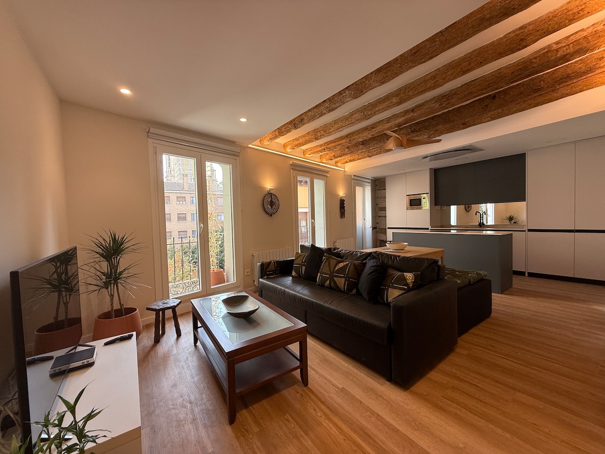 Amplio y acogedor apartamento situado en el barrio de San Pablo del casco antiguo de la ciudad. Su estilo ecléctico combina mobiliario contemporáneo con elementos originales como las vigas de madera vistas, creando un espacio confortable y con personalidad . Ideal para parejas y amigos se encuentra cerca del Pilar, La Seo, La Aljaferia, el Mercado Central, El Tubo y un Mercadona a tan solo 50 metros. Dispone de Aire acondicionado, wifi y posibilidad de parking de pago sujeto a disponibilidad.