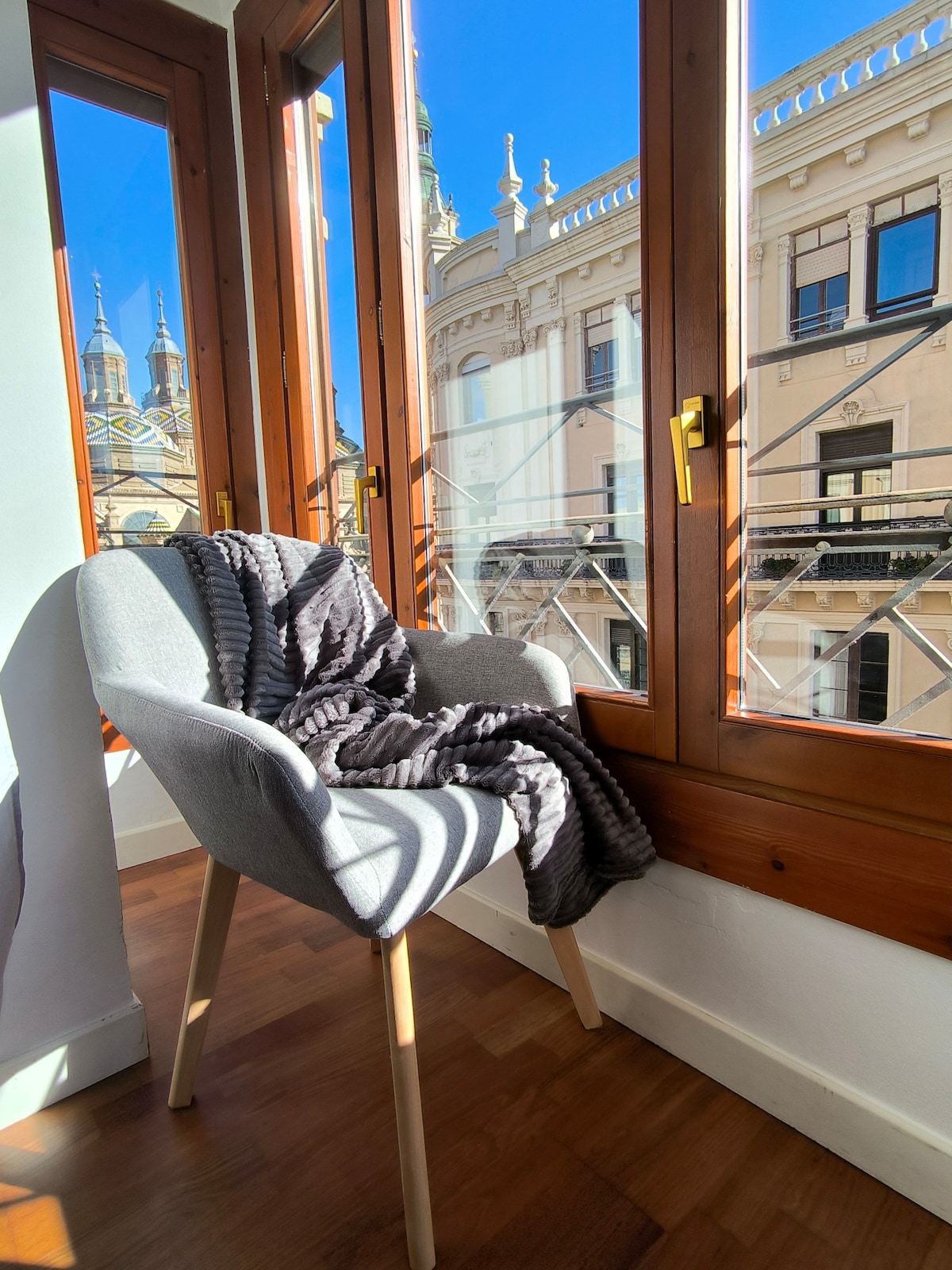 Enjoy a luxurious and comfortable experience in an unbeatable location with your partner, friends, or while working online with premium Wi-Fi. Smart TV | High-speed Wi-Fi | Pilar views | Premium mattress | Extra pillows | Welcome breakfast set | Air conditioning | Heating | Purified water tap | Air fryer | Kettle | Coffee maker | Tea | Coffee. 3 min Pilar´s Squarer | 1 min Central Market | 1 min tram | 1 min Parking | 10 min direct exit to city | 1 hour Piedra Monastery