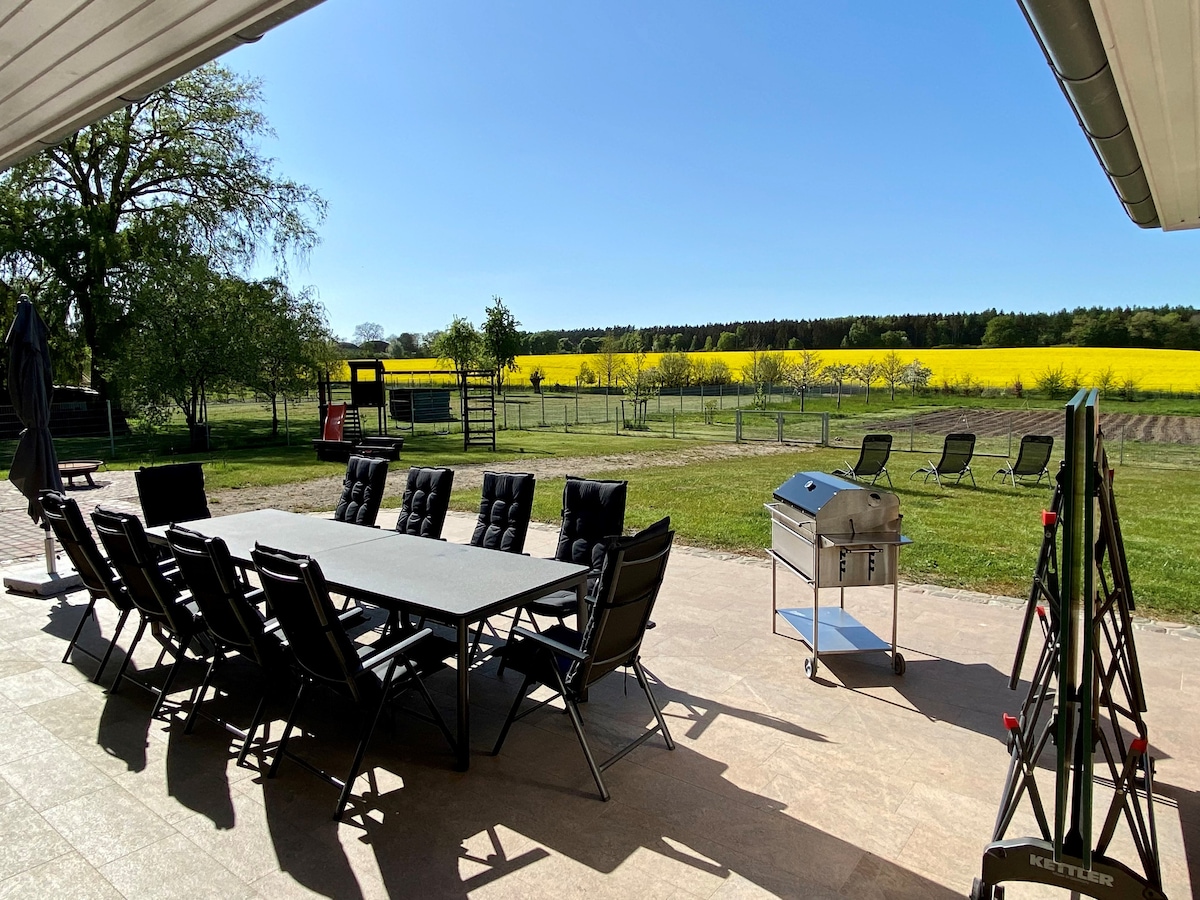Sit back and relax - in this quiet, stylish accommodation. The wooden house, built in 2023, is beautifully situated in the countryside, 5 minutes from Lake Boissow. The surrounding area in the Schaalsee biosphere reserve is ideal for cycling, hiking and birdwatching. The house has everything you need for rest and relaxation. A bright, cosy living room with a wood-burning stove, a view of nature, a sauna and a spacious covered terrace that can be used in any weather.