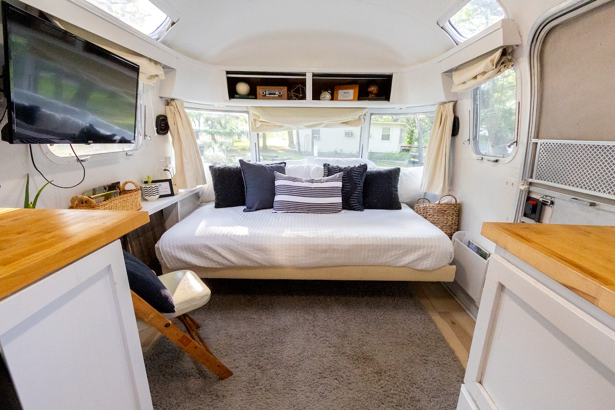 The Tiny Little Glamper is a perfect waterfront retreat for those wanting to get outdoors yet maintain their city amenities. This 1 bed/1 bath cottage has a dishwasher, refrigerator, washer/dryer, high-speed internet, & screened-in porch. On the property is a dock with a sunning deck, stairs leading into the water, and a floating dock to enjoy. There is campfire ring with lawn chairs and large mature trees. The river makes this a tranquil getaway with almost no boat traffic or current.
