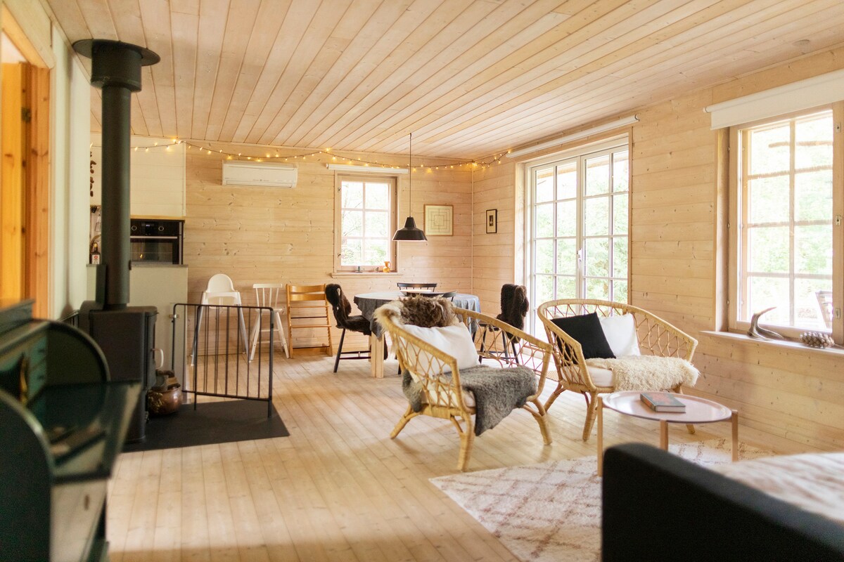 An easy escape for families who want space, calm and real comfort without giving up convenience. Our cozy 77 m² Nordic cabin is practical, warm and easy to live in, with a wood-burning stove, fast fiber Wi-Fi and an equipped kitchen with good coffee options. Outside, children can play freely in the forest garden while adults relax. Close to Mols Bjerge National Park, Ebeltoft, Ree Park Safari and Djurs Sommerland. This is our cabin – well cared for and used by our own family. Easy check-in.