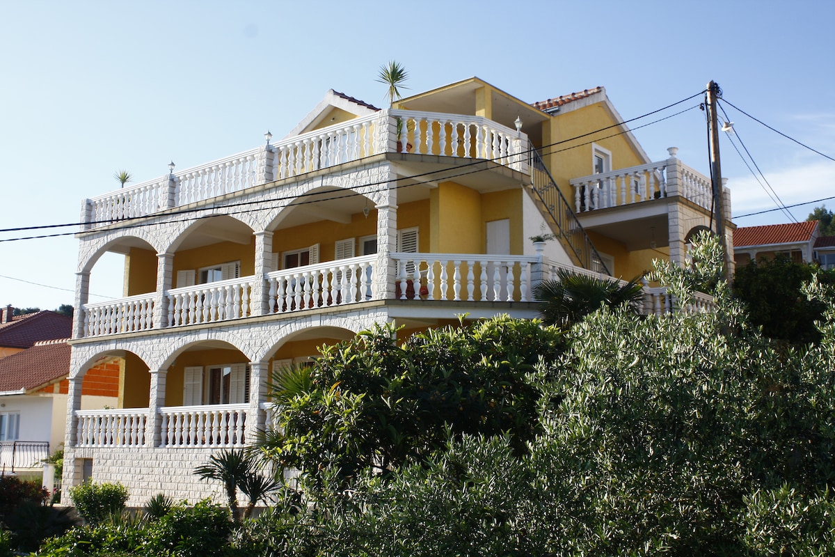 Villa Roza is situated on south west side of island Ciovo (connected by bridge to Trogir) in a peaceful location in beautiful area of town. Surrounded by a green forest, and away from the traffic and noise, just 200m away from the beach (pine forest, stone or pebble),restaurant and coffee shop. and about 800m away from the center of Trogir (under protection of UNESCO). This apartment can suit max 6 adults. Have two great rooms, living room for 2. extra persons (where from you have magnificent sea view..), fully equipped kitchen, 2 bathrooms, terrace with beautiful sea view, air conditioner, wi fi internet, SAT/TV, parking..... The distance from beach and house is about 5 min by walk, and distance from old center of town is about 15 min by walk. We hope that our offer can satisfy all your needs and wishes for a good, relaxing vacation. Be our guests and find out why in our apartments you can feel yourself as at home