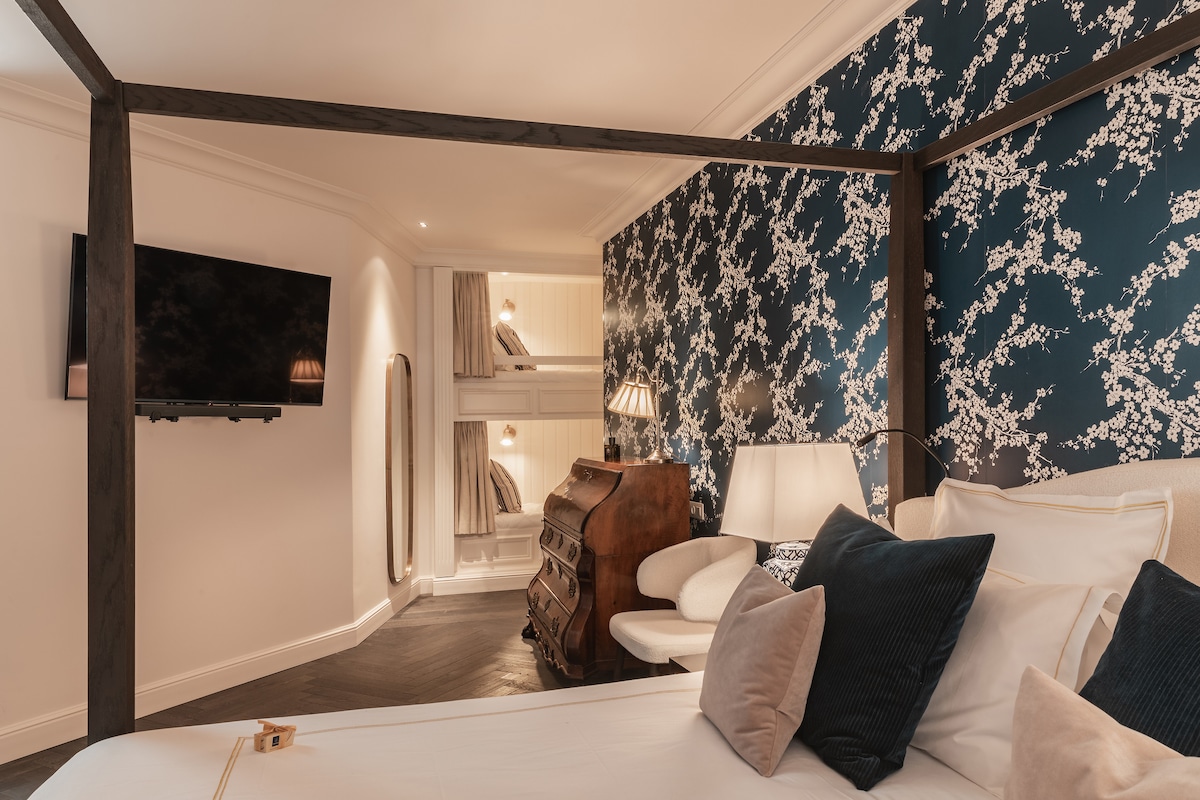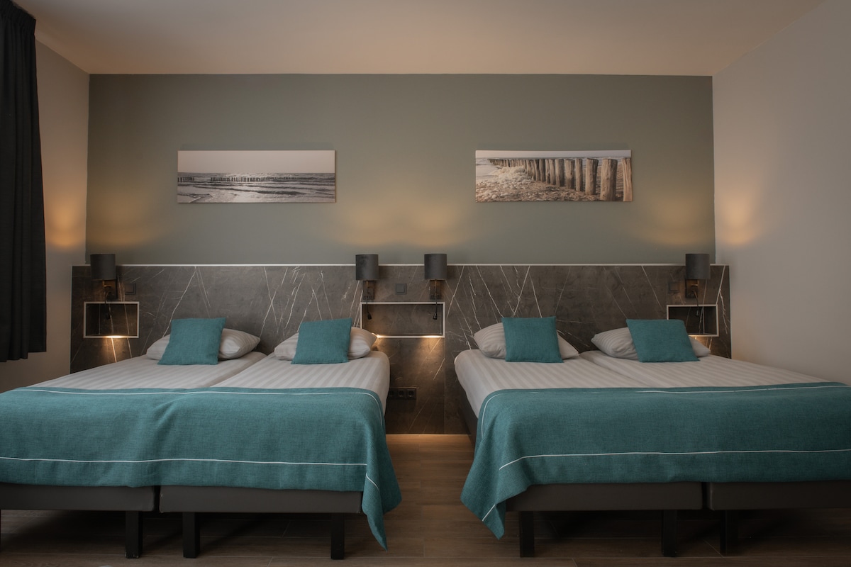 Deze gezellige familiekamer (28m2) op de eerste verdieping heeft een bedstee voor 2 kids (de afmetingen van de bedden zijn 70x120cm en 80x200cm) en een tweepersoonsbed. De aan de voorkant van het hotel gelegen kamer kijkt met de mooie grote ramen uit op de kerk waar 't Boertje en Boerinnetje pront staan te loeren. Deze kamer beschikt over een aparte regendouche en toilet. De kids kunnen na een heerlijke dag op het strand een serie kijken op de smart tv welke aan de wand hangt.