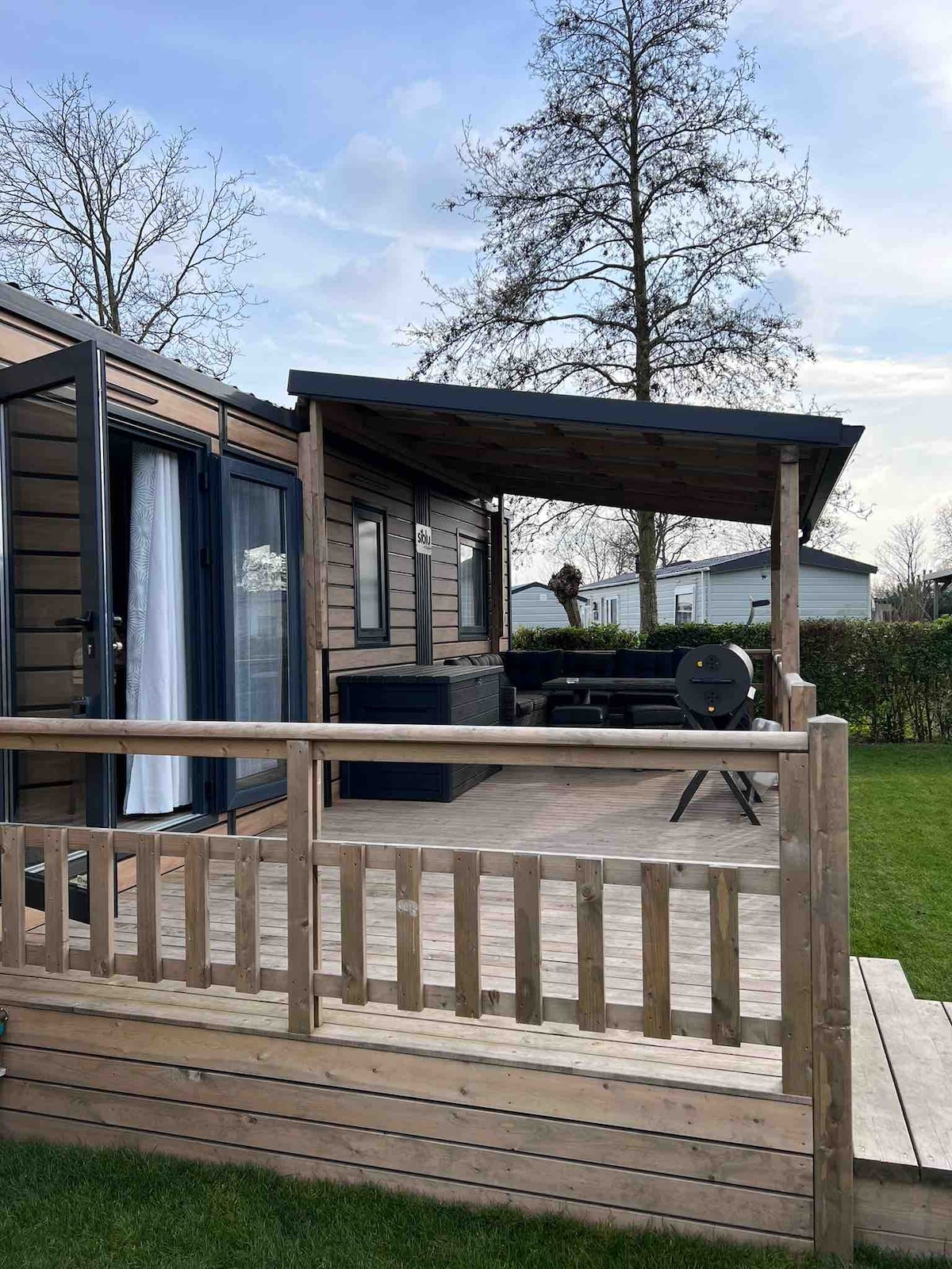 Dieses traumhafte Chalet auf dem Campingplatz „de Oase“ lässt keine Wünsche offen. Bevor man das Chalet aus 2022 betritt, steigt man auf die große, teilüberdachte Veranda, welche mit einer geräumigen Sitzecke und einem Grill zum abendlichen Barbecue einlädt. Die Air-Con sorgt im Innenbereichen für Abkühlung an heissen Tagen und für ein warmes Chalet im Winter. Der Campingplatz verfügt über einen kleinen Supermarkt mit frischen Backwaren, zwei Spielplätzen und in der Hauptsaison Animation.