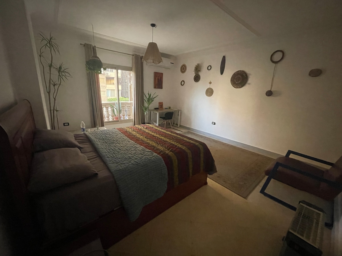 Welcome to your home-away-from-home in Korba, one of Cairo’s most charming and historic neighborhoods. This unique 1-bedroom apartment is full of character, featuring soaring ceilings, natural light, and a terrace surrounded by lush greenery. Whether you're traveling solo, as a couple, or with friends, this space gives you room to breathe, unwind, and experience Korba like a local.