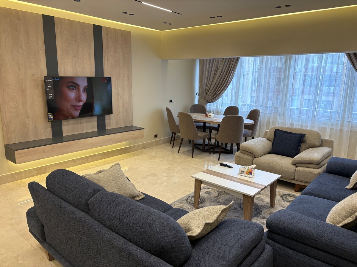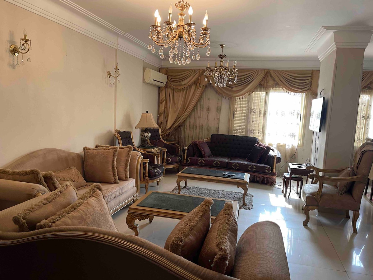 Spacious flat in the heart of Cairo, just across the road from KFC, McDonald's, Domino’s Pizza, Al Agha Restaurant Al Mandi palace, Starbucks, cafes, Dina farms pastries, Convenience stores nearby, Gym, Shopping malls, 24 hours Pharmacy. 20 min drive to the airport, short walk to Roxy Square, Maryland Park, 45 minutes Drive to the Pyramids of Giza, The flat Sleeps up to 7 people, perfect for families or groups. Enjoy a comfortable stay in this prime location, perfect for exploration of Cairo.