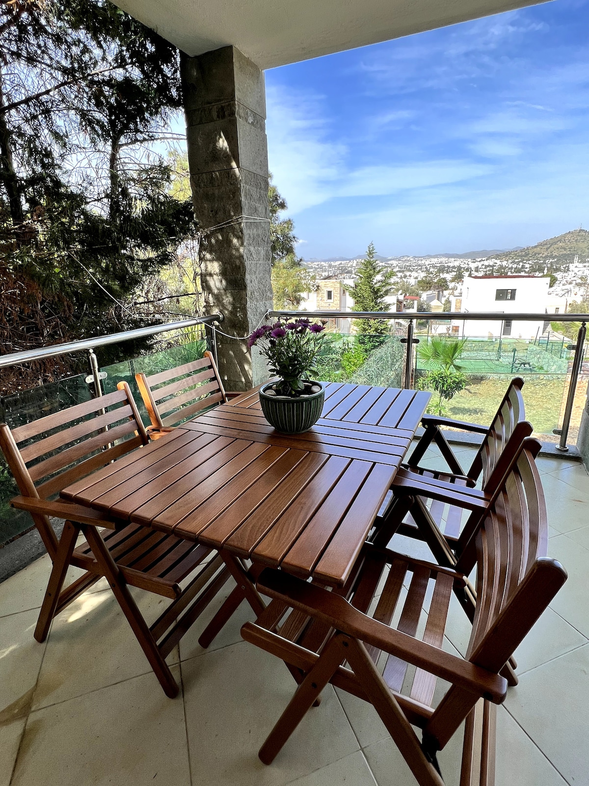 Luxury property, with panoramic views across Bodrum, private pool(fully private, for your exclusive use - only accessible from the apt) ; 2 bedrooms, 2 bathrooms, large private sun deck, fully equipped kitchen , bedclothes & bathroom towels provided, in a quiet residential area, few minutes walking distance from the town center, and beach:) Furnished and kept in "White" in conformity with the local colours of Bodrum, with pink Bougainvillea giving shadow. https://myalbum.com/album/DedlvO3eIvto