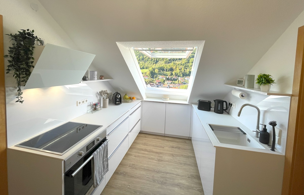 Willkommen am Fuße der Schwäbischen Alb. Die Ferienwohnung ist neu renoviert und im hellen modernen Stil eingerichtet. Es ist ein großes Zimmer mit neuer Küche, einem Doppelbett und einem Schlafsofa. Es gibt ein modernes Bad mit Dusche. In einem kleinen Zwischenraum ist eine Waschmaschine. Ein Trockner kann bei Bedarf genutzt werden. In der Küche befindet sich eine Kaffeemaschine, ein Kühlschrank mit Gefrierfach sowie einer Mikrowelle.