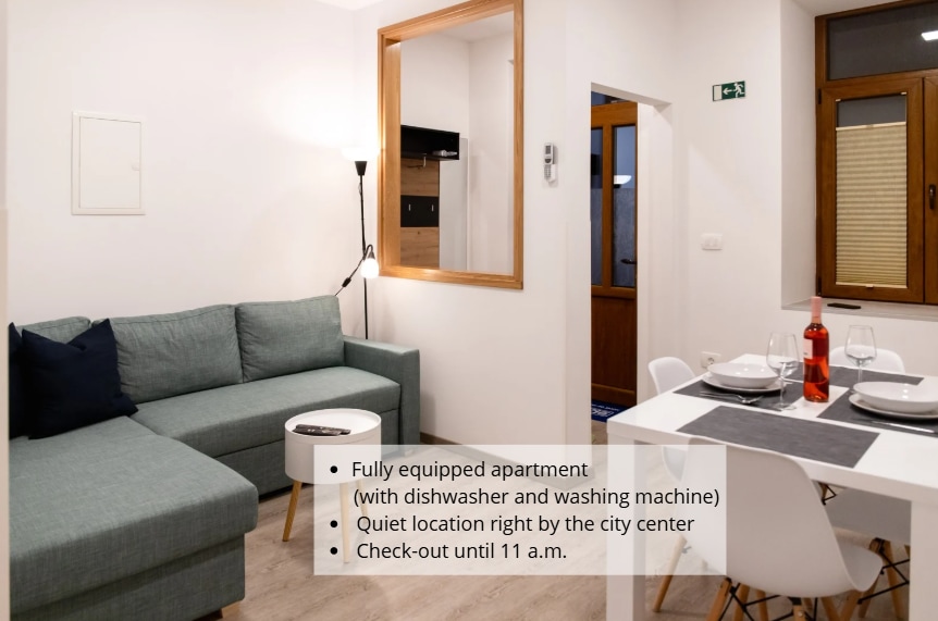 The unit includes a fully equipped kitchen, free WiFi, a TV with international channels, air conditioning, washing machine, microwave oven and a first aid kit. The bathroom is equipped with a shower, a hairdryer, an electric radiator, and essential amenities. The windows are fitted with mosquito nets and pleated blinds. Towels and bed linen are also provided. The apartment offers additional items to enhance your stay and provide comfort, but we’ll leave those as a surprise.