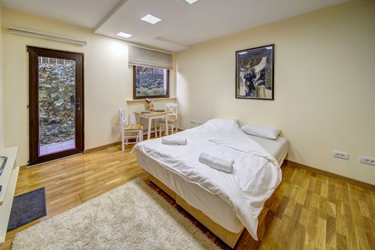 Newly renovated studio, located in New Belgrade, in Tošin Bunar street, 10 min by car from downtown and 20 min by bus. The bus stop is within 1 min walking from studio. It is also very close to Zemun, Gardoš tower, a nice bohemian part of city with many restaurants and galleries on the Danube river. There is One big sofa that doubles as a Bed. Please note that you can profit from a shared backyard, however the studio has a private entrance. Smoking is strictly Forbbiden in the studio.