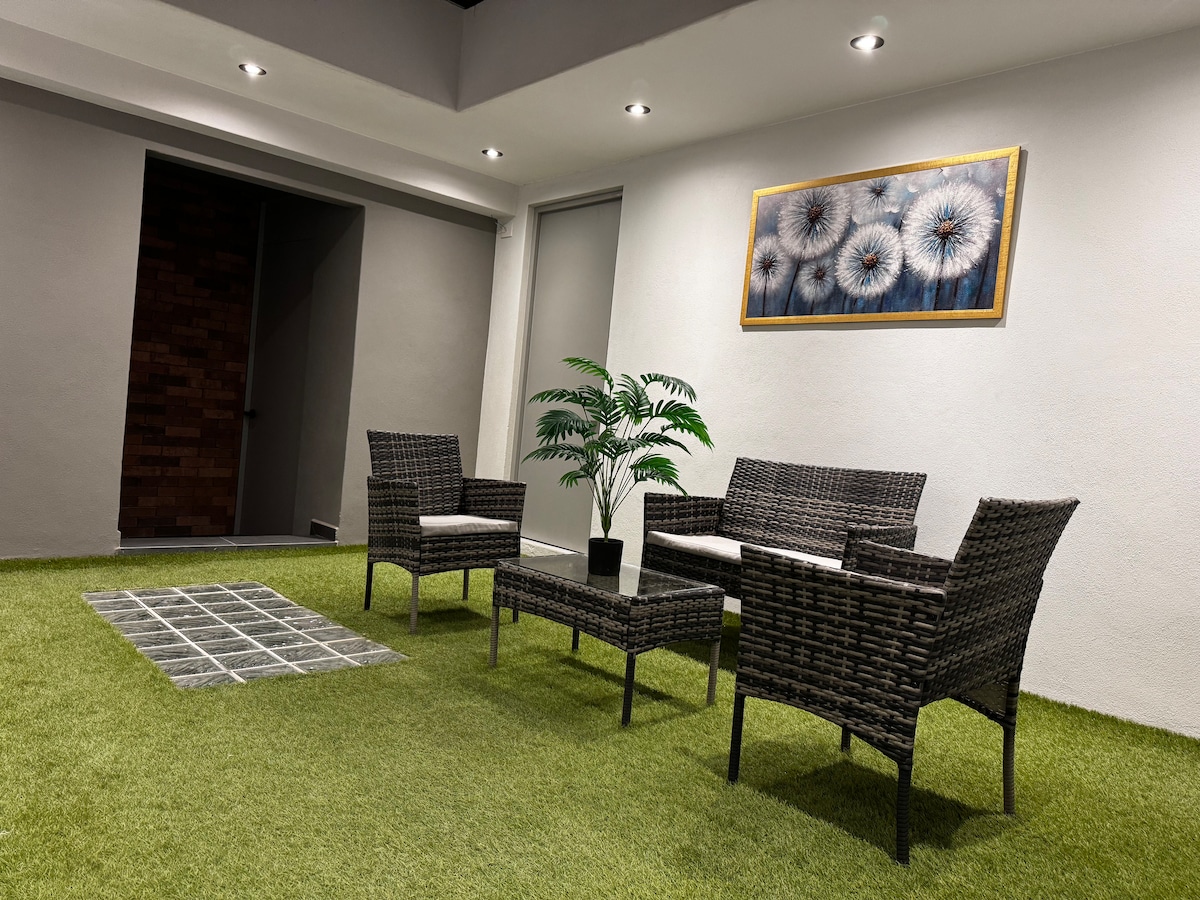 Enjoy a stylish experience at this cozy studio apartment in the heart of Querétaro City center. Perfect location if you are visiting the city. Walking around the area you can find restaurants, bars, cafes, museums, stores and much more. The apartment has a fully equipped kitchen, spacious full bathroom, cozy bedroom with TV, AC, closet and a working space. It also has a shared entrance, small shared patio with an outdoor dining table, and a lot of plants to make you feel at home.
