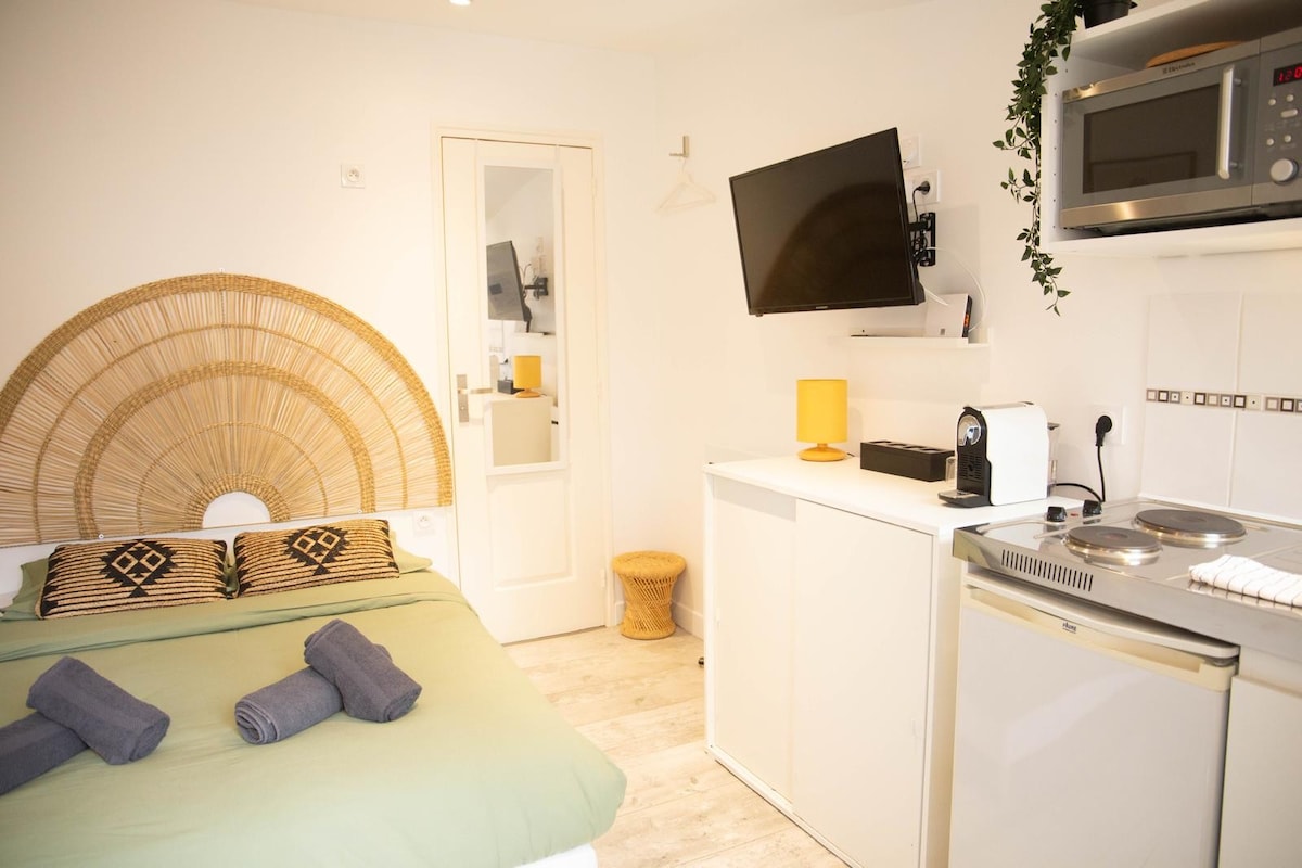 Charmant studio dans une résidence paisible offrant une place de parking gratuite pour votre confort. Notre studio moderne et élégant est idéal pour les voyageurs en quête de tranquillité et de commodité. Profitez de l'intimité de votre propre espace, d'une cuisine entièrement équipée, d'un lit confortable, et d'un coin salon agréable. De plus, nous fournissons les produits de première nécessité tels que des serviettes, du savon, du shampoing, et des articles de cuisine de base.