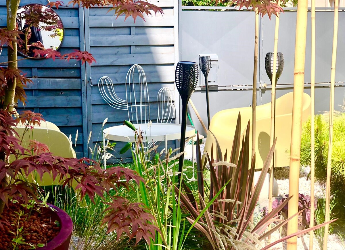 Je vous reçois dans un joli T1 entièrement neuf. Vous pourrez profiter d'un petit jardin japonisant .L'appartement de plein pied, fait partie d'une maison des années 30 mais vous avez une entrée indépendante, afin de vous sentir chez vous. Il comprend une sdb privée ainsi qu'une cuisine équipée, et une chambre séparée. A 8 mn à pied du centre historique Proche école de commerce Quartier résidentiel, très calme Proche tous commerces tram et bus (3mn à pied) Parking gratuit dans la rue