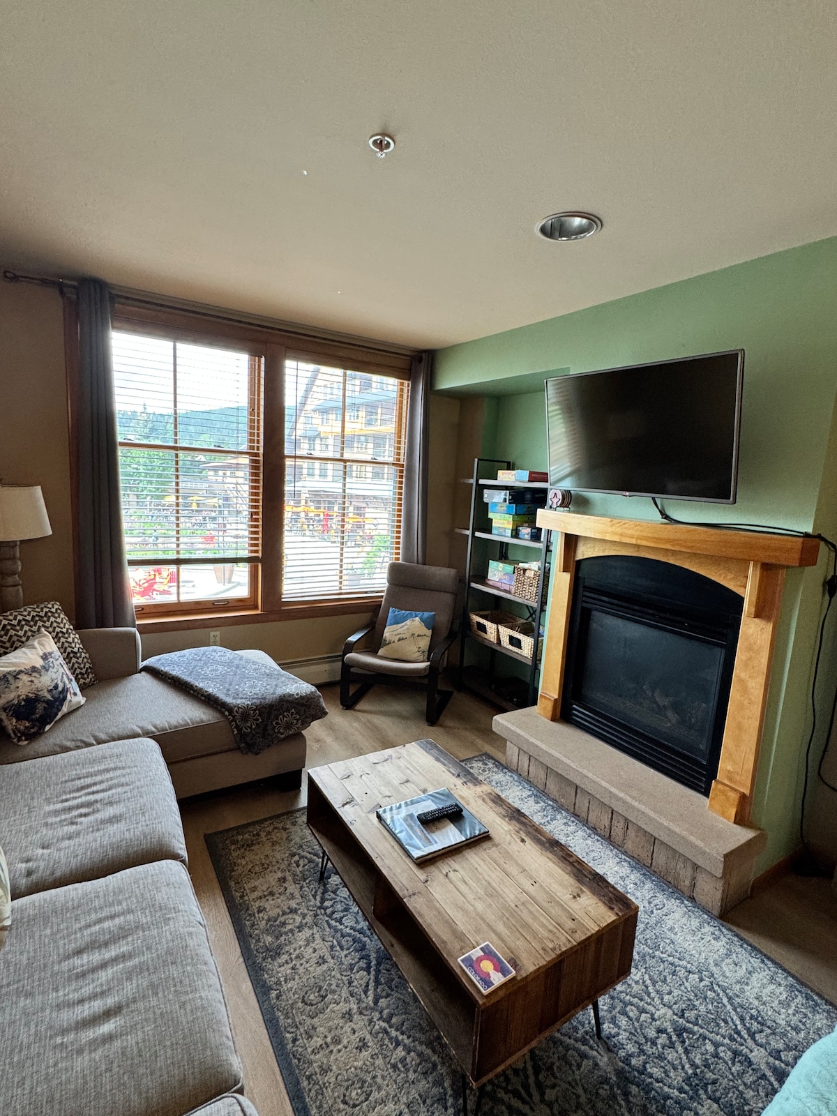 Awesome Front Corner Condo w/mountain views/private deck in modern building. Two heated outdoor hot tubs, firepits, grilling areas, 3 king beds (hi end sleeper). 3 smart TVs (recording dvr), in-unit washer/dryer, 2-3 min walk to gondola. New appliances, fully stocked kitchen, computer desk w/chair in 2nd br, walk-in pantry, full-sized fridge, induction stove/oven, blackout blinds. Paid Parking (Winter Park Short-Term Rental Registration No. 005388)