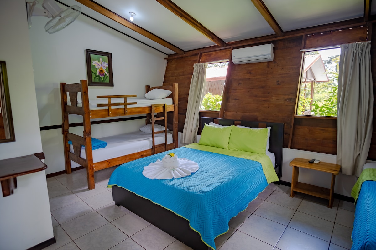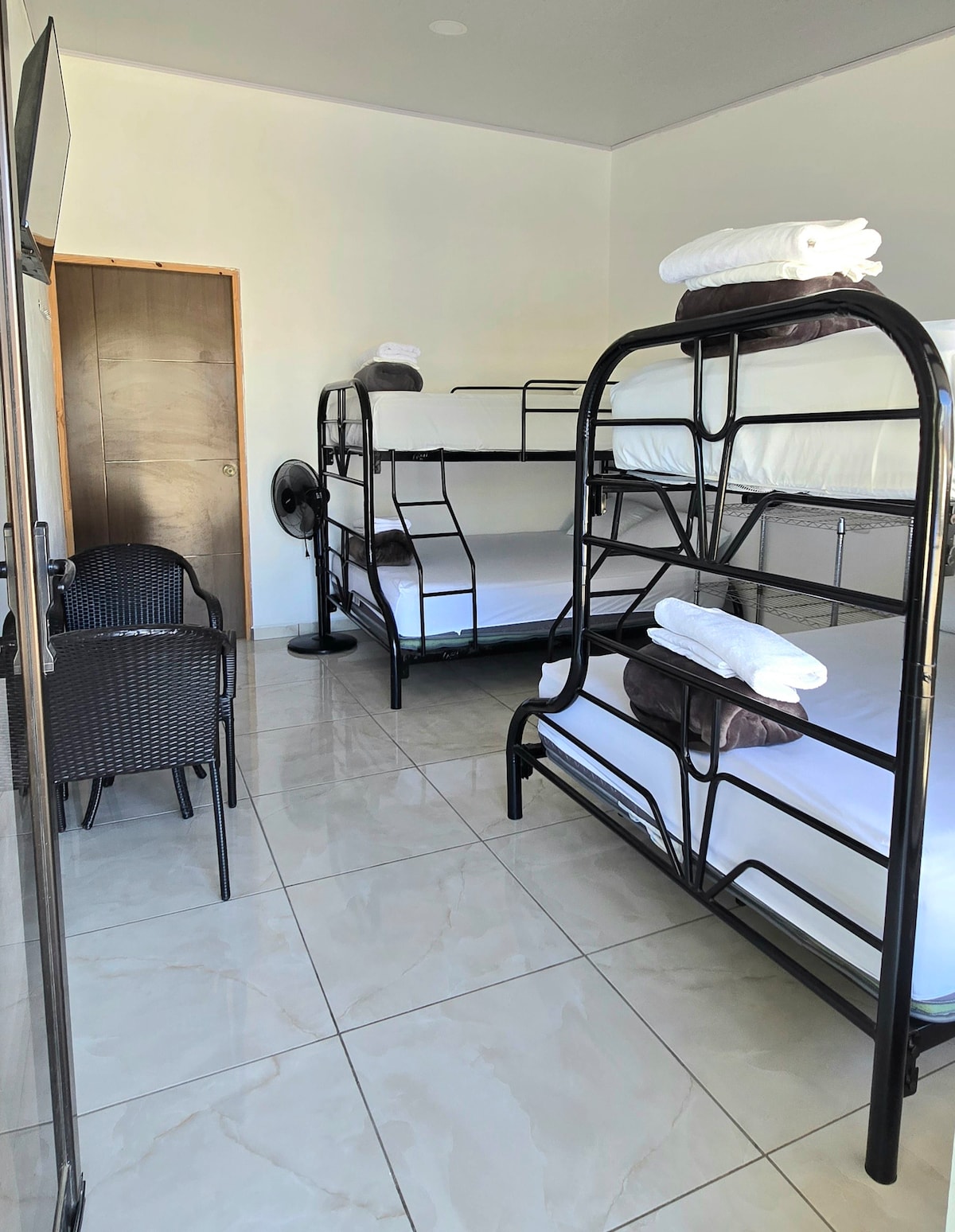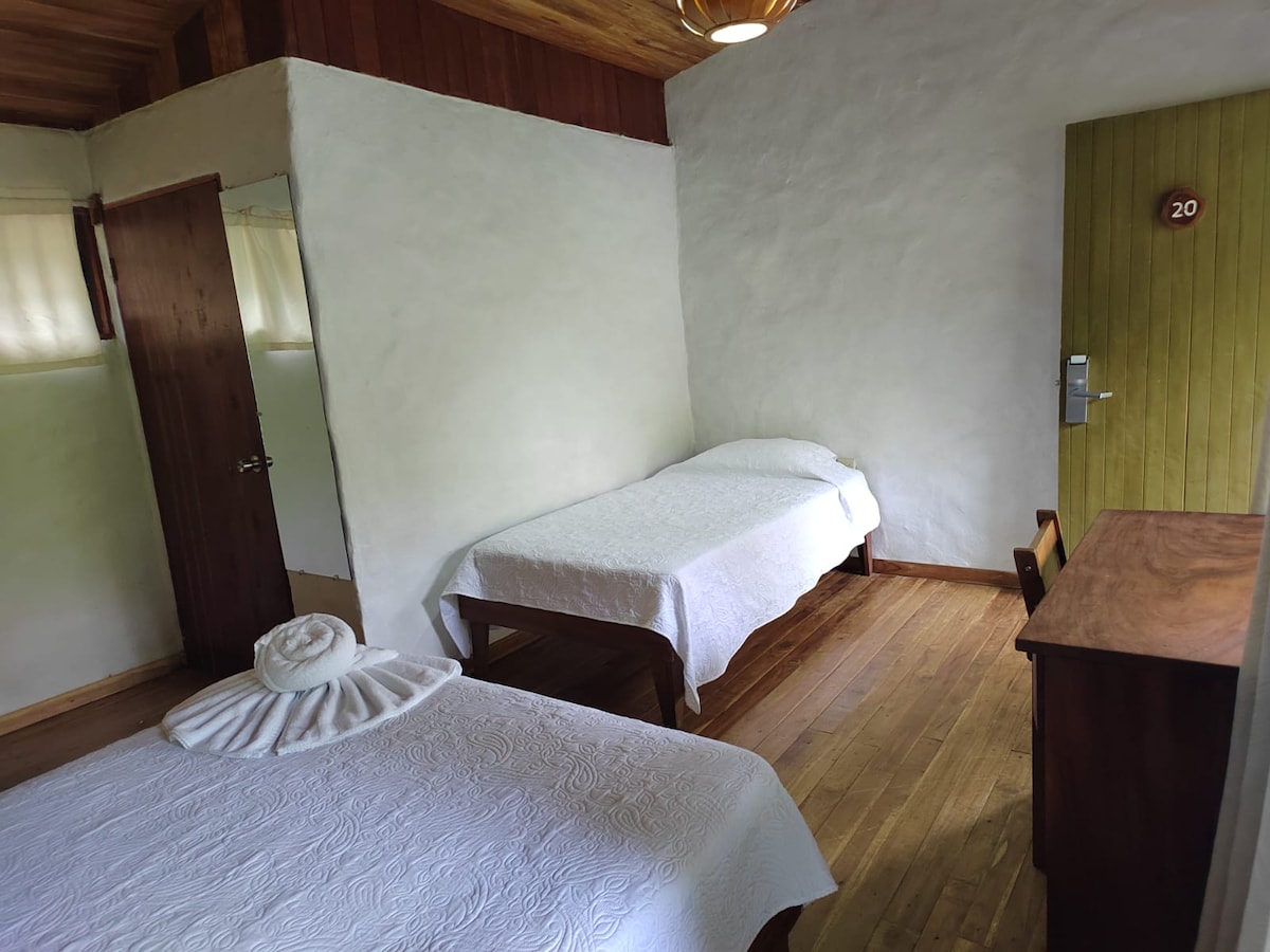 Hostel 2 min from the center of La Fortuna, with a relaxing river and nature. Free use of common areas, work space, exercises, shared kitchen... The private rooms have air conditioning, bathroom with hot water, 2 double beds with orthopedic mattresses, refrigerator and microwave oven inside the room. Cozy place in harmony with nature, sometimes we are visited by different types of birds and sloths.
