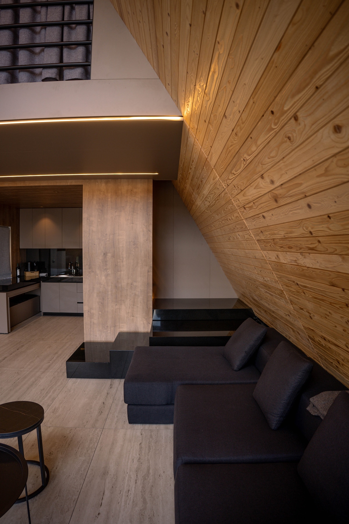 The room holds light like water, its beige walls absorbing the day. The fire glows low, more breath than flame. Green velvet chairs sit in quiet thought, tucked into corners made for slowing down. Nothing asks for attention. Everything offers it. The bathroom opens like silence: clean, unspoken. A full 360° view surrounds the space, with mountain views from the terrace and a clear view of the sea from the balcony. Here, stillness is not absence. It is design. A space meant to feel, not perform.