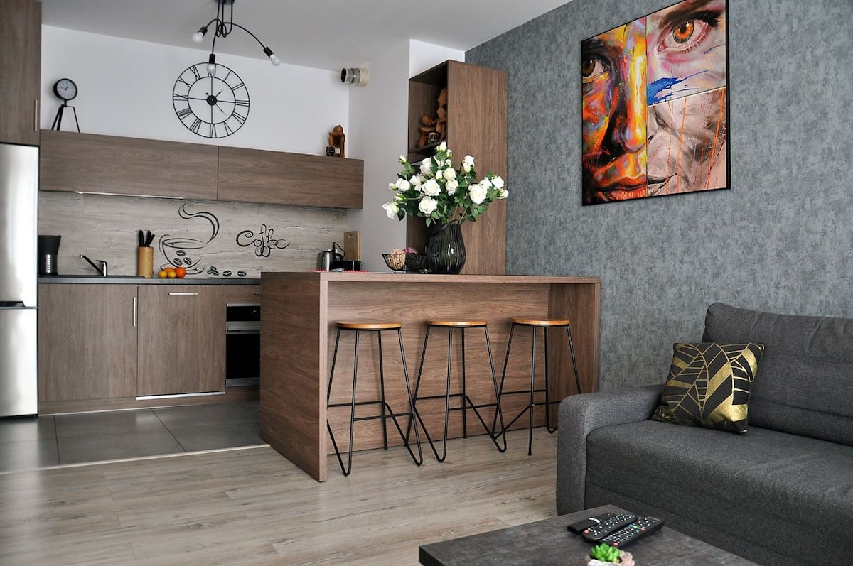ENG below / Ten apartament to mix wyrafinowania i współczesnego designu / Bezpłatny parking podziemny / Feel of a hotel, convenience of an airbnb / Mieszkanie jest wyposażone na każdą codzienna okoliczność, tak by spełnić wymagania gości przybywających nawet na długie wizyty. W razie potrzeby - komfortowa rozkładana sofa oferuje dodatkowe miejsca do spania. Funkcjonalna, stonowana przestrzeń sprzyja skupieniu podczas biznesowego wyjazdu, jak i relaksowi, kiedy słońce zachodzi nad miastem.