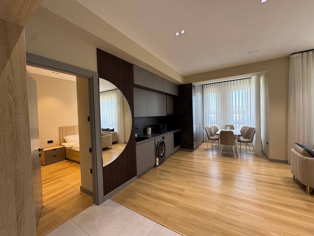 Стильная студия в новом здании Prestige Gardens, расположена в 5 минутах езды от аэропорта и Южного вокзала. - 1 двуспальная кровать - 1 раскладной диван - Свежий ремонт - Есть все для комфортного проживания: - WIFI, Smart TV -Холодильник, стиральная машина - Оборудованная кухня - Кондиционер, утюг, фен - Бесплатная парковка возле здания - Станция для зарядки электромобиля - Удобное расположение, до центра города 10 минут езды - Наличие ресторанов и супермаркетов поблизости
