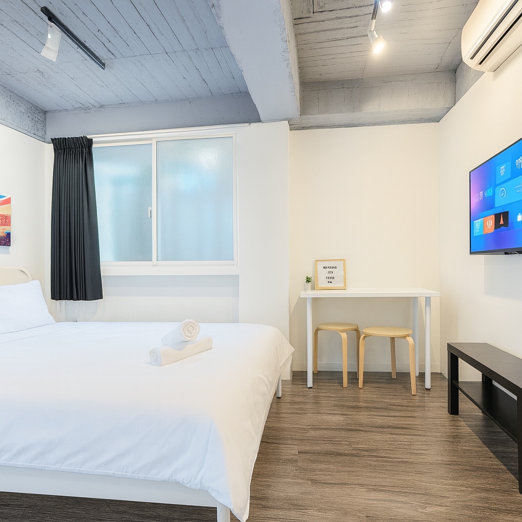 室內的灰白主色,配搭北美木紋銅色傢俱及家飾, 用心為您的居住空間提供沈靜優雅的感覺。日韓系電器的選用,不論是無線充電藍牙喇叭,大螢幕伸縮高清電視,都能滿足您對影音效果的要求。房源位於高樓內縮樓層,阻絕不必要的噪音並滿足您對景觀,安靜及隱私的要求。大樓並配有全天候警衛,住戶專屬電梯,公用大露台,以及地下收費停車場, 位處西門町核心路段,無論搭乘捷運或自駕都非常方便。Earth tone- based interior design offers warming, calm, healing and delighted atmosphere. Room facilities, including double bed, en- suite bathroom with shower enclosure, air conditioning, smart 4K TV with movies/Netflix, WIFI internet, cove lighting and music player with wireless connection & USB charger ports.