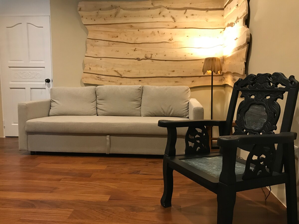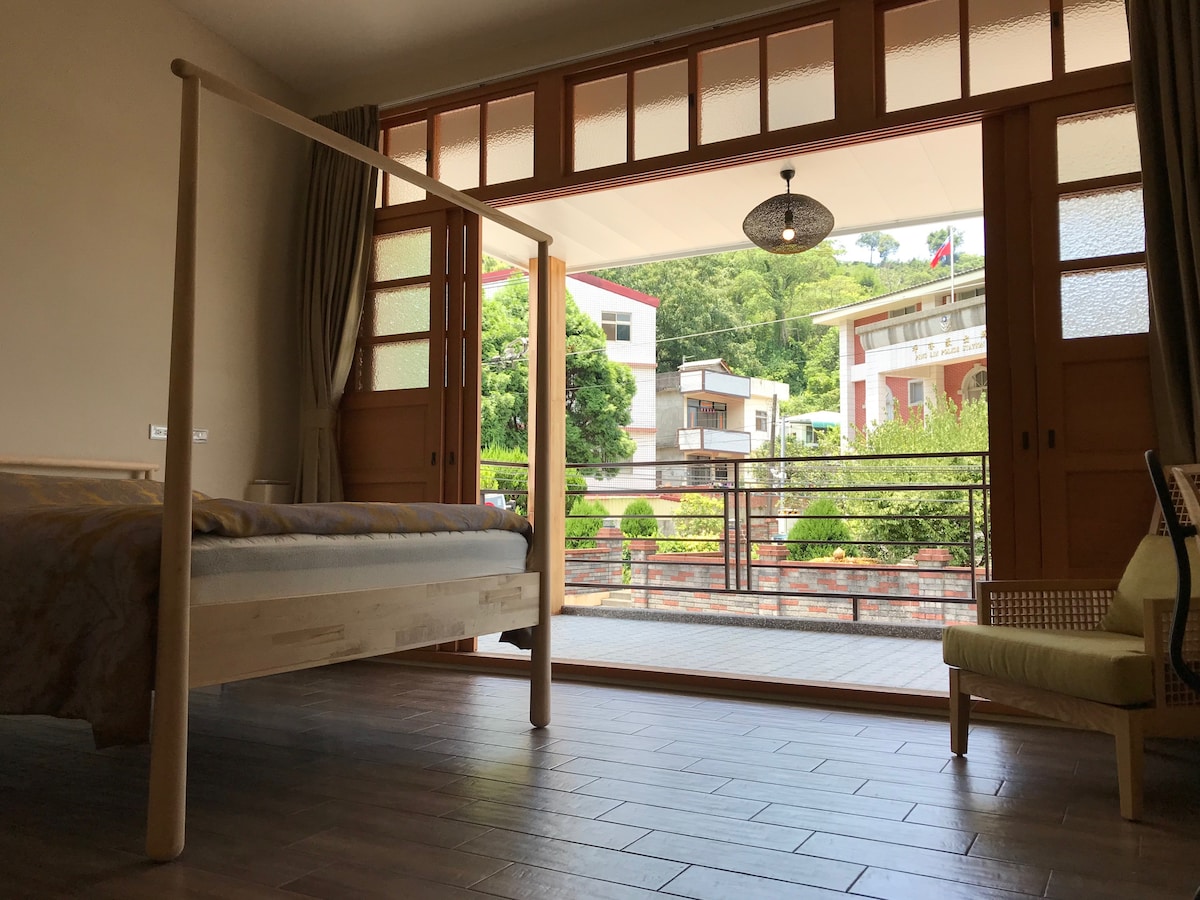 位於民宿B&B一樓,一房一廳單位。全實木地板,香柏木製超大雙人床,房間緊臨書房區,可使用空間約15坪(54sqm),很合適2-4人左右家庭或群組入住!