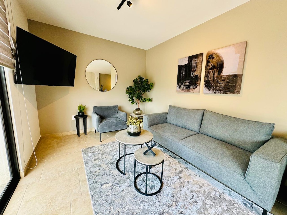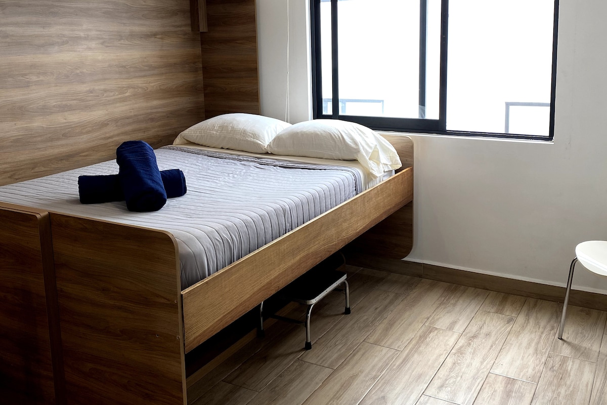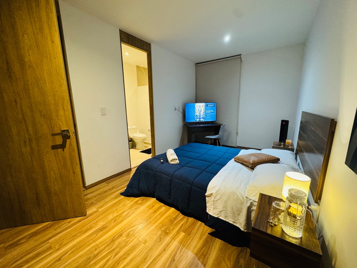Enjoy an unforgettable stay at Suite Pitahayas, a modern, bright, and thoughtfully equipped space designed to offer you comfort and tranquility in the heart of Zibatá, Querétaro. With a spectacular view, two Queen-size beds (one inflatable upon request), and a cozy TV lounge, it’s perfect for up to four adults—whether you’re here to rest, work, or unwind. The building features an OXXO convenience store, laundry facilities, and cafés, surrounded by parks, gardens, and safe areas.