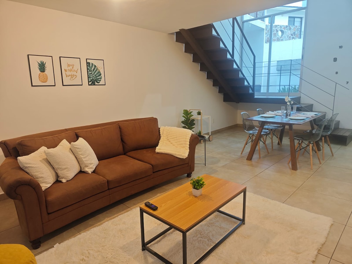 Enjoy an unforgettable stay at Suite Pitahayas, a modern, bright, and thoughtfully equipped space designed to offer comfort and tranquility in the heart of Zibatá, Querétaro. Spectacular views, two Queen Size beds (one of them inflatable, available upon request at least 24 hours in advance), TV living area perfect for up to 4 adults, whether you are here to rest or work. Features an OXXO convenience store, laundry facilities, and cafés, and is surrounded by parks, gardens, and safe areas.