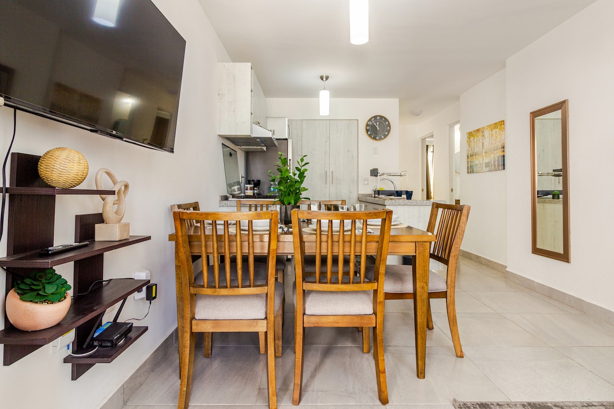 Brand-new, located in the heart of Juriquilla, this 160 m2 apartment offers a one-of-a kind experience, going above and beyond with amenities & entertainment. If you are looking for top quality, look no further and come to the most modern & luxurious apartment in Queretaro for an unforgettable stay Walking distance from Starbucks, Walmart, Bars and top restaurants like Sonora Grill & Hunger, this apartment has it all, comfortable beds, balcony, OLED 4K TVs and a 100" Home-Cinema from your bed