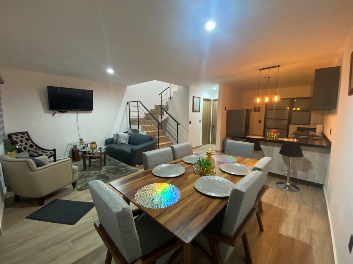 Casa amueblada hasta 6 personas. Diseño moderno y sencillo. En zona residencial de queretaro. Acceso a área común para carne asada, cancha de básquetbol. Extensas áreas verdes. Furnished house up to 6 people. simple, modern design. In residential area of queretaro. Access roast common area, basketball court.
