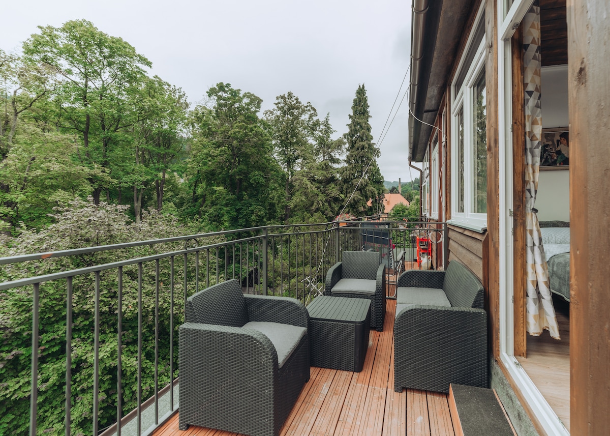 Klimatyczny dom z lat 20-stych na wyłączność z prywatną sauną, banią i samodzielnym wejściem. Na parterze znajduje się salon z kominkiem i dużym rozkładanym narożnikiem, przestronna kuchnia z częścią jadalnianą, łazienka z prysznicem oraz sauna. Na piętrze dwie sypialnie, jedna z łożem małżeńskim i druga z dwoma łóżkami pojedynczymi. Dom umieszczony jest na ogrodzonej działce, przylega do domu właścicieli i jest u podnóża góry Szczytnik. Z okien rozpościera się widok na łąki i wzniesienia.