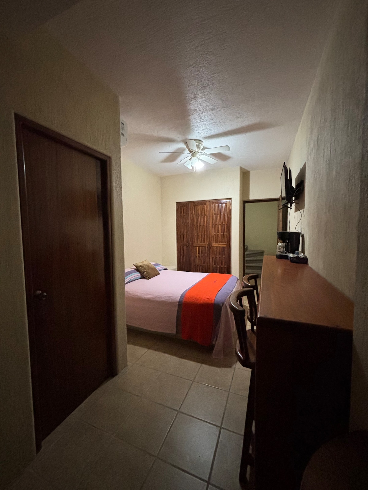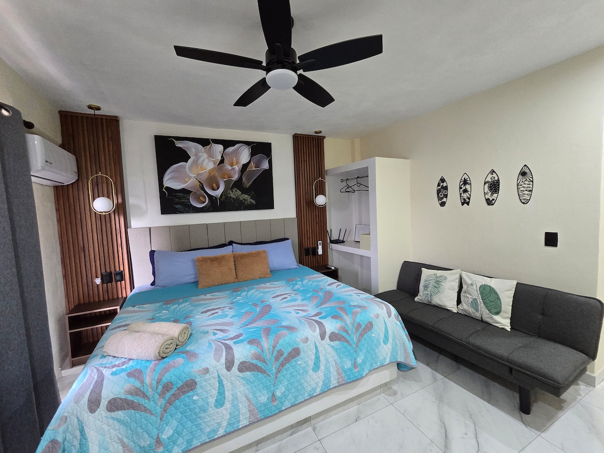 El Loft o estudio cuenta con una cama king size, cocineta equipada, a/c, tv cable y wifi. Esta a solo una cuadra de la playa de la madera (3 a 5 min caminando) y menos de 10 min caminando del centro de Zihuatanejo, Playa la Ropa 15 min caminando. Esta en una calle muy viva donde encontraras varios restaurantes, cafeterías para comer y lugares de oció. Excelente ubicación.
