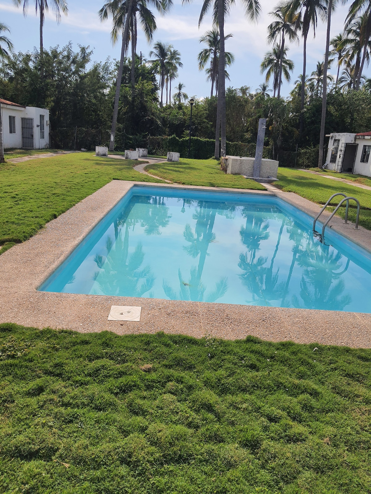 Es una bella casa rodeada de jardines, frente a la alberca en la cual puedes relajarte y disfrutar de música, o leer un libro, toda la casa con aire acondicionado, la cocina completamente equipada, a 15 min. caminando a la playa. seguridad las 24 hrs