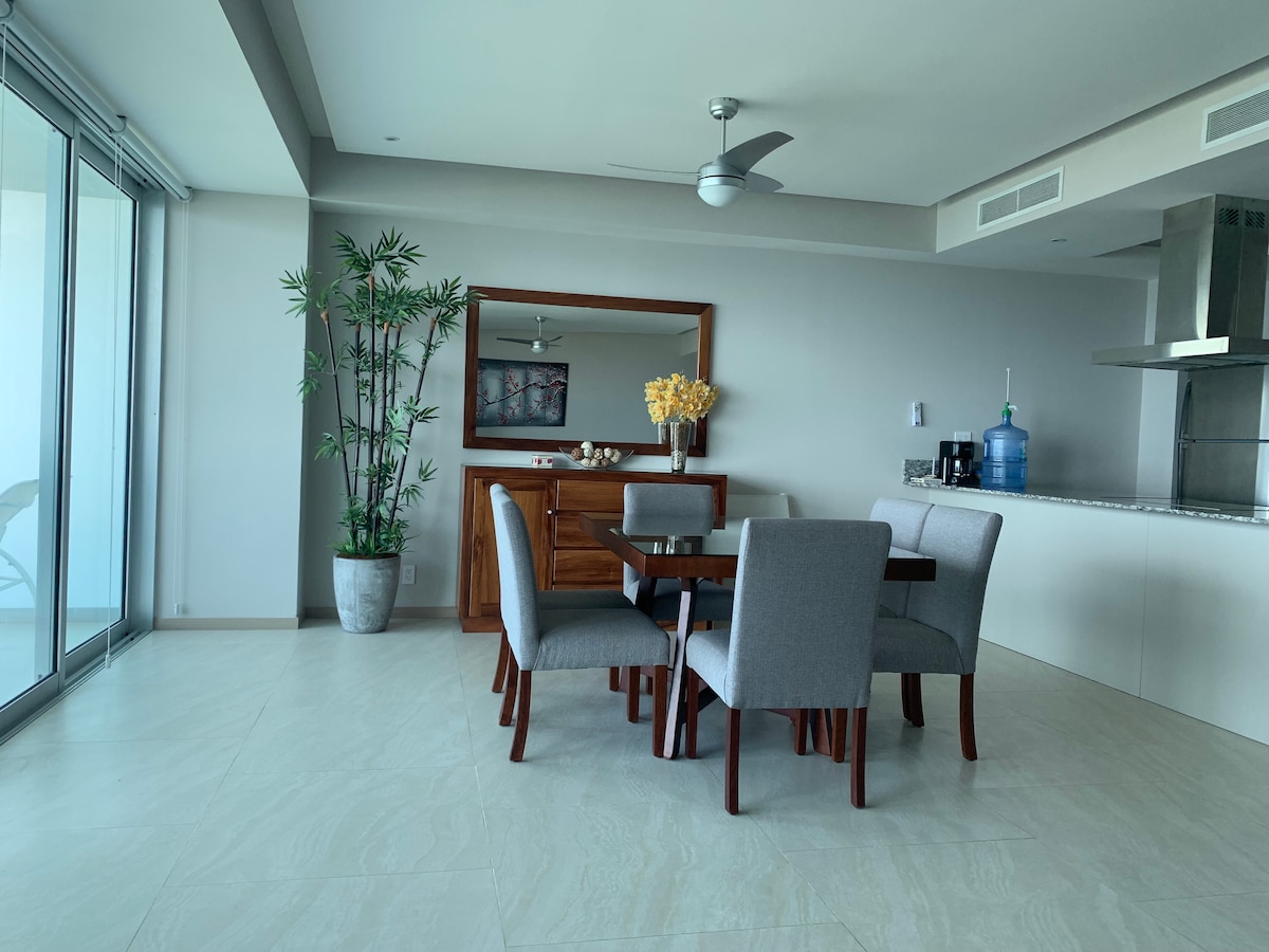 Cuenta con todo lo necesario para que pases unas vacaciones increíbles. La vista al mar es perfecta desde la cocina, desde el comedor, desde la sala, en la recámara principal o en la terraza. La cocina está totalmente equipada por si deseas cocinar con todos los accesorios. El servicio es de primera, los meseros están siempre muy al pendiente por si necesitas botana o una bebida en la alberca. Pueden ir caminando a la zona de restaurantes, a la marina o a las tiendas comerciales.