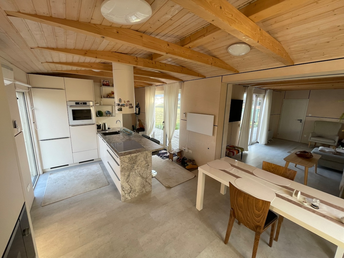 Our wooden cabin is situated between two rivers. So it is a wonderfull and very peacefull place to stay. Downstair, there is a main room, with modern kitchen, fridge, washing machine, diswasher machine... there is a fireplace, that can heat whole cabin. The large terace is great place where you can enjoy your cup of tea or coffee. the garden and surounding is a really great place for kids. and if the weather will be bad, thay will maybe happy from swing low in the cabin... :-)