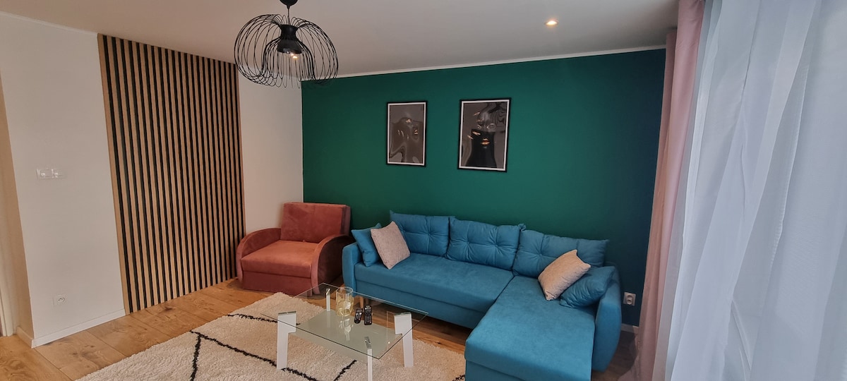 I offer a super-equipped apartment for short-term rent. It has a spacious living room with a sofa bed and a bedroom with double bed. The apartment has an equipped bathroom with a bathtub and a kitchen, so it is also suitable for longer stays. The apartment has a view of the park (fall bars, children's playground). It is located near the city center and many types of shops are within walking distance. Public transport stop (2 minutes) that will take you directly to the city center (5 minutes).