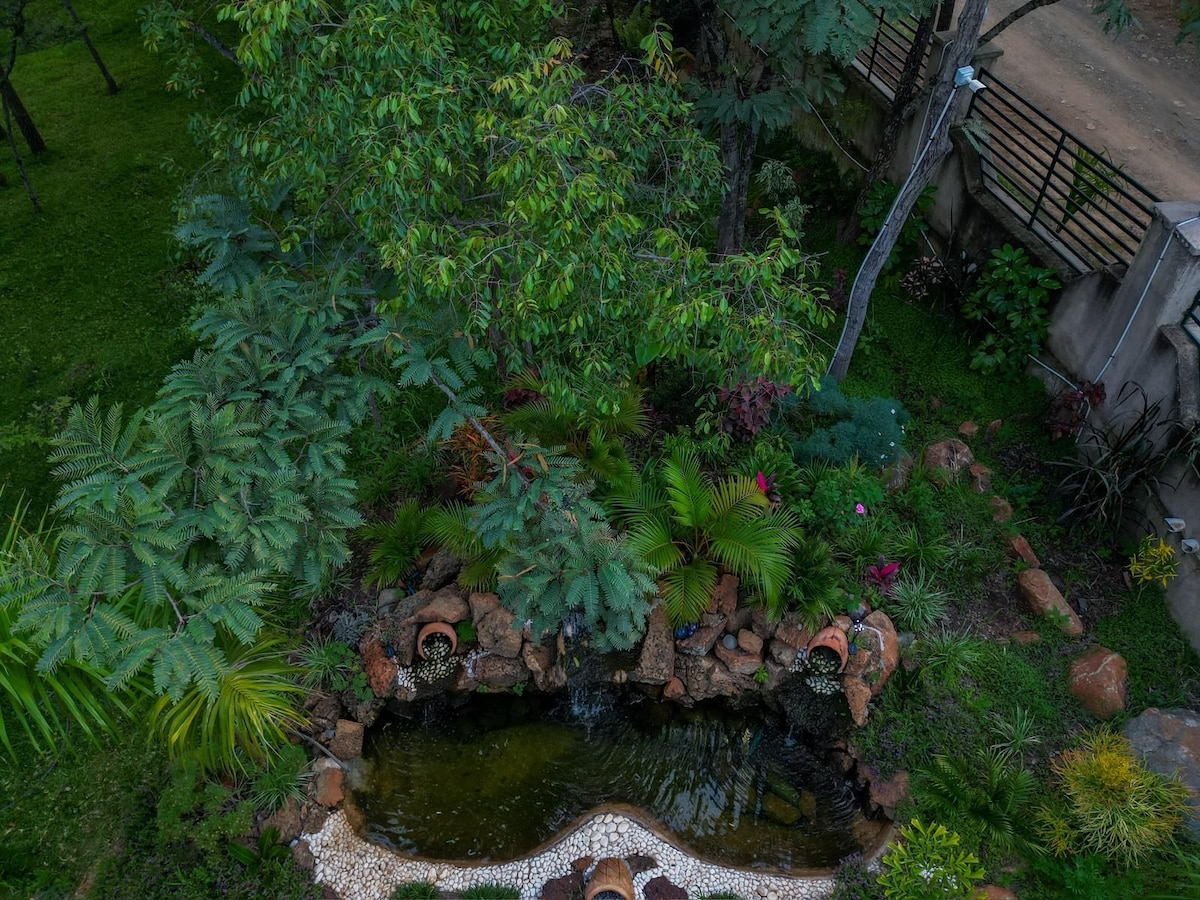 Forget your worries in this spacious and serene space.Escape to our luxurious Honeymoon Suite—an intimate retreat designed for romance and relaxation. Enjoy a spacious layout featuring a private pool, lush garden, queen bed, and elegant lounge space. Thoughtfully equipped with air conditioning, an exercise bike, office nook, and refreshment station, this suite offers the perfect blend of comfort and privacy for your special stay.